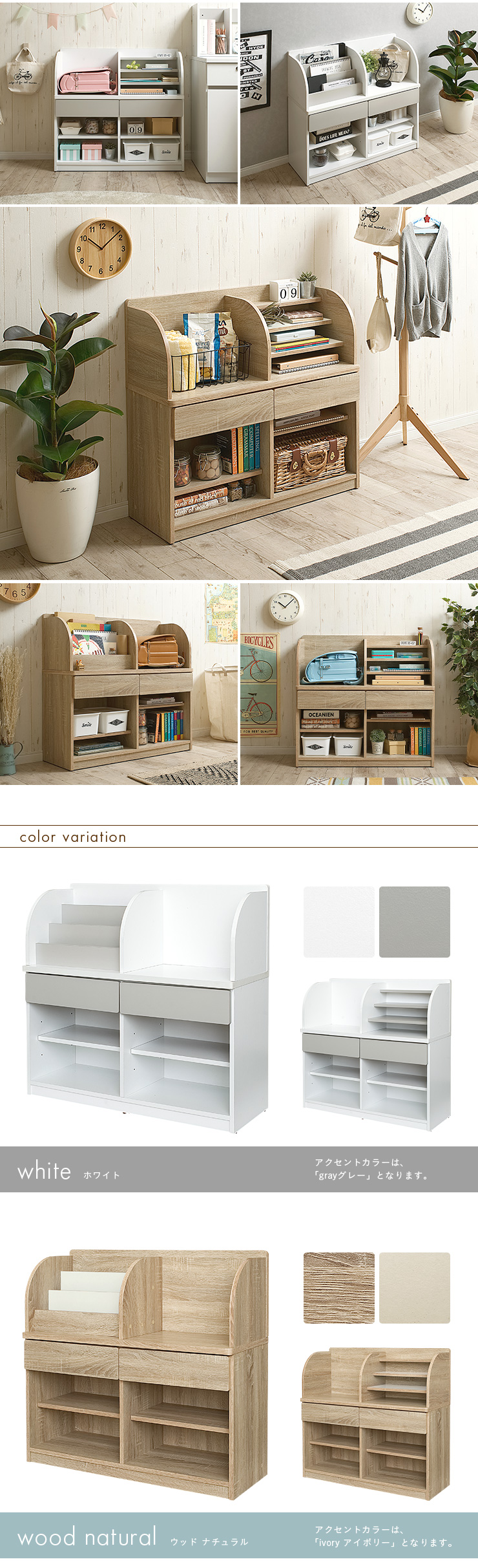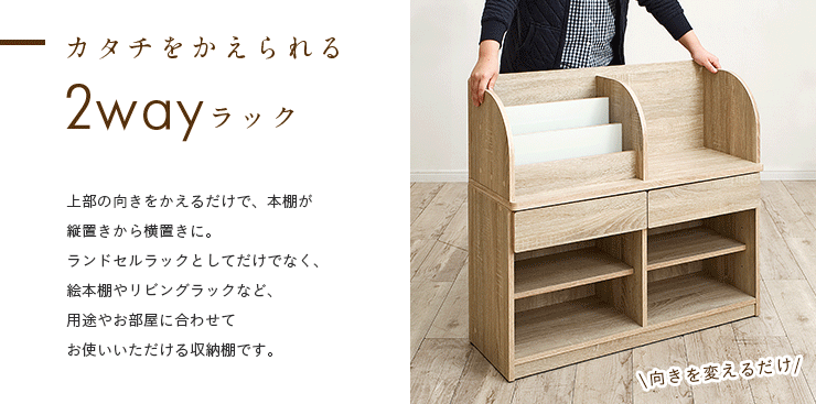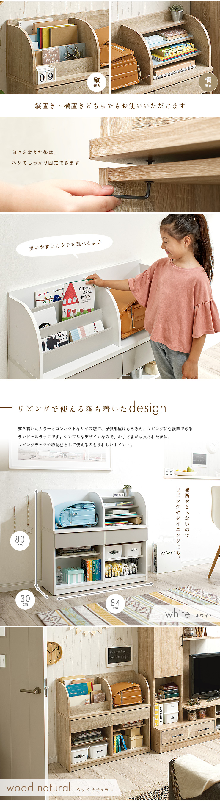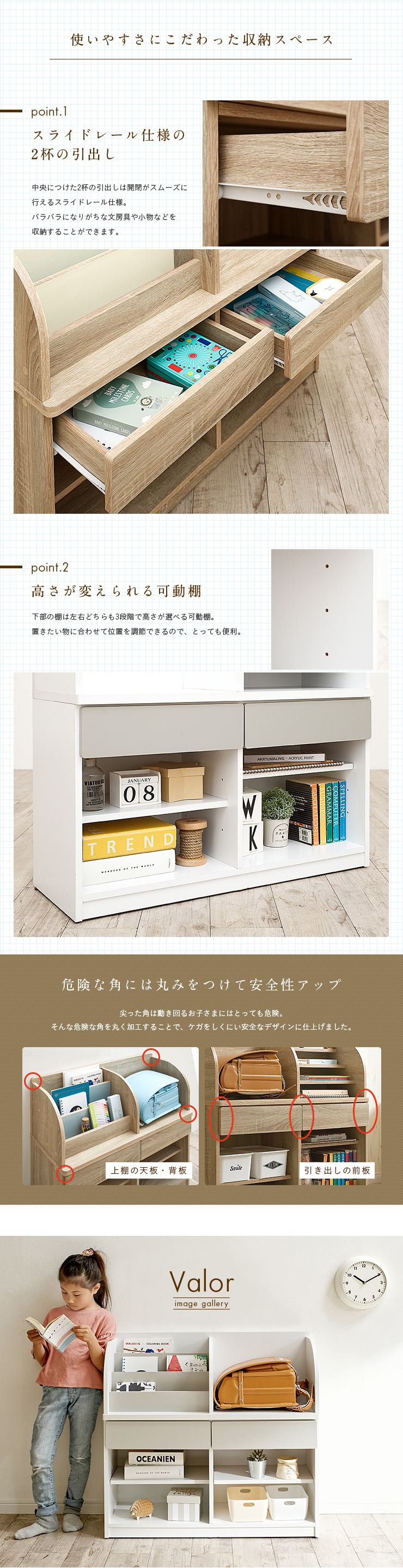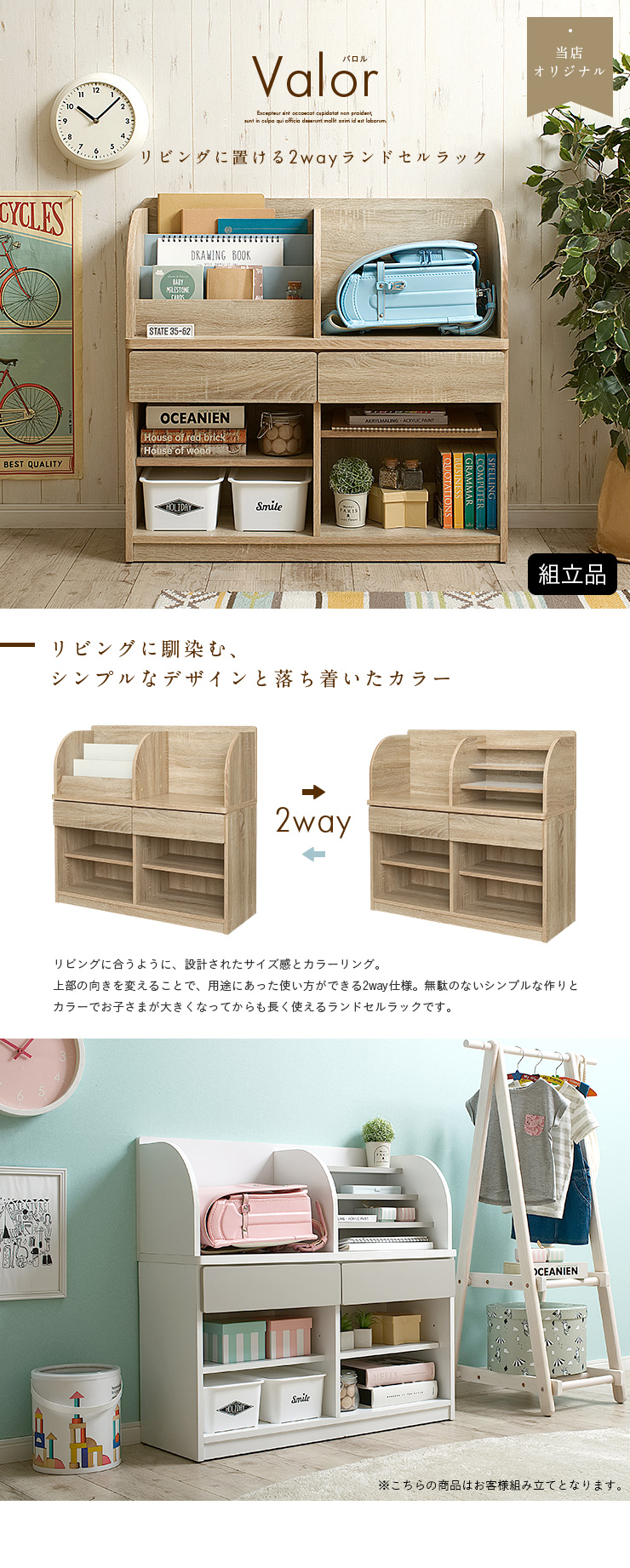 | リビングに置ける 2wayランドセルラック Valor(バロル) リビングによく馴染む、シンプルなデザインと落ち着いたカラー リビングに合うように、設計されたサイズ感とカラーリング。上部の向きを変えることで、用途にあった使い方ができる2way仕様。無駄のないシンプルな作りとカラーでお子様が大きくなってからも長く使えるランドセルラックです。 ■カタチをかえられる2wayラック 上部の向きをかえるだけで、本棚が縦置きから横置きに。ランドセルラックとしてだけでなく、絵本棚やリビングラックなど、用途やお部屋に合わせてお使いいただける収納棚です。 ■リビングで使える落ち着いたデザイン 落ち着いたカラーとコンパクトなサイズ感で、子供部屋はもちろん、リビングにも設置できるランドセルラックです。シンプルなデザインなので、お子さまが成長された後は、リビングラックや収納棚として使えるのもうれしいポイント。 ■使いやすさにこだわった収納スペース 【point.01】2杯の引出し 中央につけた2杯の引出しは開閉がスムーズに行えるスライドレール仕様。バラバラになりがちな文房具や小物などを収納することができます。 【point.02】高さが変えられる可動棚 下部の棚は左右どちらも3段階で高さが選べる可動棚。置きたい物に合わせて位置を調節できるので、とっても便利。 ■危険な角には丸みをつけて安全性アップ 尖った角は動き回るお子さまにはとっても危険。そんな危険な角を丸く加工することで、ケガをしくにい安全なデザインに仕上げました。 ※こちらの商品はお客様組み立てとなります。 | |