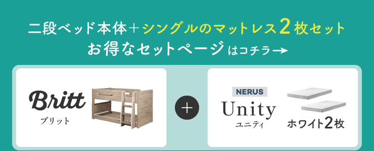 | 2段ベッド Britt(ブリット) コンパクトで使いやすい2段ベッド Bunk bed Britt(ブリット) ■クッション性のある樹脂製のTモール仕様 お子さまが触れる部分には弾力のある樹脂製のTモールをつけることで安全性をアップしました。 ■ライフスタイルが変わっても使える分割仕様 上下を分割してシングルベッドとしてもお使いいただけます。長く使えるからとっても経済的。 ■2台連結してキングベッドのようにも使える 2人で並んで寝てもOK。隣に顔が見えて安心。 ※中央にフレームがございます ■便利なコンセント付き宮棚 便利な2口コンセントを上下どちらにもつけました。スマホやタブレットを立てて置けるからとっても便利。 ■使いやすい低めの下段設計 ・ホコリが入りずらい ・小さなお子さまも出入りしやすい ・下段空間高が広くなる ※こちらの商品はお客様組み立てとなります。 ※マットレスや寝具などは付属しておりません。 ※詳細ページの注意事項を必ずご確認ください。 | |