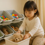 箱をいくつか並べて置いて、物を使ったら戻すという習慣をつけてもらえば、自分で片付けができる第一歩になります。おしゃれな箱を置くことで、中にぬいぐるみやおもちゃなどを入れるだけで、おしゃれなインテリアになります。隠そうとするのではなく、見せる収納を上手く活用していきましょう。