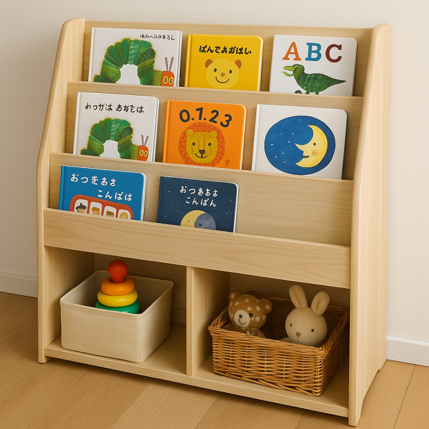絵本を重ねて置ける奥行きと、表紙がしっかり見える高さに設計されているため、小さなお子さまでも「読みたい本」をすぐに見つけられます。