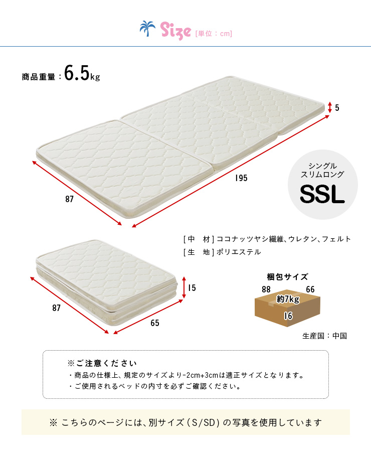 | ココナッツパームマットレス am(アム) シングルスリムサイズ 可愛らしいシンプルなカラーのアイボリーと、カラフルなカラーとキュートなパステルチェックのデザインがお子様にもぴったりなマットレスです。フチには耐久性のあるパイピング加工を施し、糸のほつれを防止します。さらに全体に施したキルティング加工で丈夫さアップ。デザインのアクセントにもなっています。シンプルなアイボリーと爽やかで可愛い3色、ブルー・イエロー・ピンクをご用意しました。 天然ココナッツ繊維を使用しており、地球にやさしい商品です。硬めの素材のため、体が沈み込むことがなく正しい姿勢を保つことができ、成長期のお子様や腰痛持ちの方には特におすすめです。 生地にはポリエステルを使用し、つるつるとした気持ちいい肌触りに仕上げました。 通気性、保湿性に優れ、夏は涼しく冬は暖かくお過ごしいただけます。また、通水性にも優れており、眠っている間に発する汗をこもらせず発散することができ、カビが発生しにくいのも嬉しいポイントです。いつでも快適な睡眠をサポートします。 ※ご使用するベッドの内寸をご確認ください。 ※写真はSサイズを使用しております。 | |