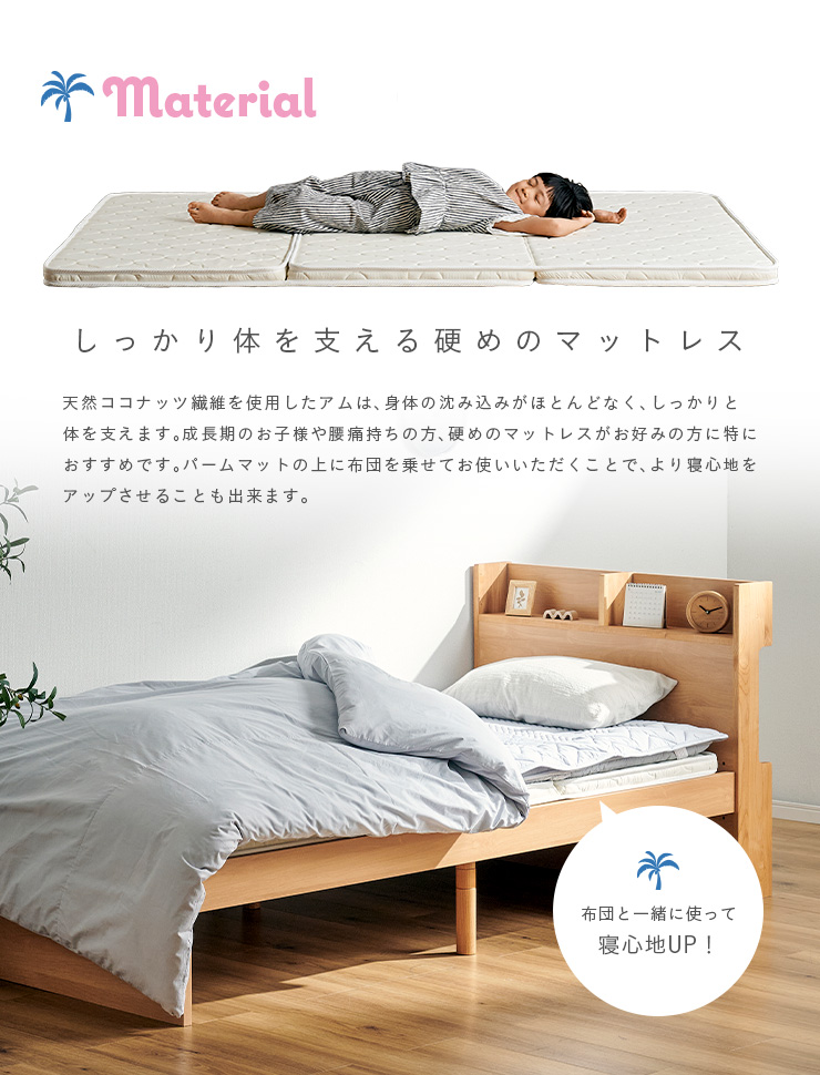 | ココナッツパームマットレス am(アム) シングルロングサイズ 可愛らしいシンプルなカラーのアイボリーに、キルティング模様がアクセントのおしゃれなマットレス。耐久性のあるパイピング加工を施し、糸のほつれを防止します。全体に施したキルティング加工でさらに丈夫さをアップ。丈夫で可愛らしいアムはお子さまにぴったりのマットレスです。 天然ココナッツ繊維を使用しており、地球にやさしい商品です。硬めの素材のため、体が沈み込むことがなく正しい姿勢を保つことができ、成長期のお子様や腰痛持ちの方には特におすすめです。 生地にはポリエステルを使用し、つるつるとした気持ちいい肌触りに仕上げました。 通気性、保湿性に優れ、夏は涼しく冬は暖かくお過ごしいただけます。また、通水性にも優れており、眠っている間に発する汗をこもらせず発散することができ、カビが発生しにくいのも嬉しいポイントです。いつでも快適な睡眠をサポートします。 ※ご使用するベッドの内寸をご確認ください。 ※写真はSサイズを使用しております。 | |