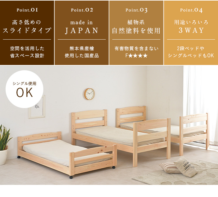 | 九州産ひのきの上小節を贅沢に使用し体にやさしい水性塗料で仕上げたスライド三段ベッド 3段ベッド Litory(リトリー) ■省スペース設計の空間を活用した高さ低めのスライドタイプ 下段はキャスターが付いたスライドベッド。中段の下にすっぽりと収まり、日中ベッドを使用しない時はお部屋を広々とお使いいただけます。また、ベッドとしてだけでなく収納スペースとしても活用できシーズンオフのお布団やラグなど大きい物も収納することが可能です。 ■made in Japanの熊本県産檜を100%使用した国産品 節が小さく目立ちにくい等級の「上小節」を贅沢に使用し、有害物質を含まない植物系自然塗料で仕上げました。国産檜を贅沢に使用した三段ベッドは、まるで森林浴をしているかのような心地よさの中で眠ることができます。 ■体にも環境にも優しい水性塗料 次世代スタンダード水系塗料のアクレックスを使用。ひのきを汚れや日焼けから守り、体や環境にやさしい塗料です。 ■2段ベッドやシングルベッドにも用途いろいろ3way仕様 Litoryは3段ベッドだけではなく、分割して2段ベッドやシングルベッドとしてもお使いいただけます。ライフスタイルの変化や必要に応じて、お好きなカタチに変えられるのでお子さまが成長してからも長くお使いいただけるベッドです。 ■どこにでもかけられるフックタイプはしご はしごはフックがついたひっかけタイプを採用。いつでも簡単に取り外しができ、出入口に関係なくどこにでもかけることができます。ステップ部分は30cm×6cmの昇り降りしやすいフラットタイプとなってます。 ※針葉樹である檜には節が必ず存在します。節を理由とした返品・交換は対象外となりますので、予めご了承ください。 ※こちらの商品はお客様組立となります。 ※マットレス・寝具等は別売りとなります。 | |