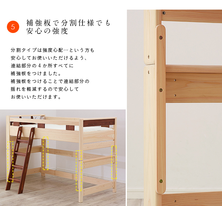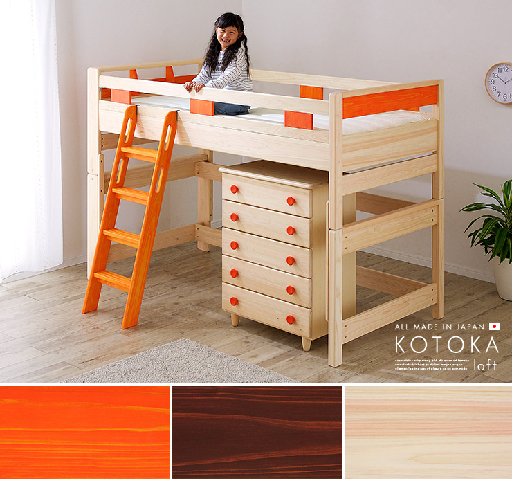 | ALL MADE IN JAPAN KOTOKA loft (コトカロフト) 檜の無垢材の中で眠ることは、とても贅沢な睡眠環境です。五感の中で最も記憶に残りやすい「匂い」檜のよい香りを子供たちの思い出に 材料の檜からこだわり抜いた正真正銘の国産ロフトベッド「KOTOKA」。 日本一家具の町・福岡県大川市の職人たちが熟練した技術で造り上げ、長年使えば使うほど、艶や色合いに表情がでてくる檜のベッドはお子様の 成長とともに、味わい深いベットとなります。肌触りの心地よい熊本県産檜の無垢材でつくられていて、ビタミンカラーがアクセント。子供たちが想像力あふれる時間を過ごせるように、遊び心があるデザインに設計しました。 ○「KOTOKA」 ができるまで 1.材料 熊本県産檜 節の少ない等級の「上小節」をさらに選別した高品質の檜材 贅沢な睡眠空間に 驚きの檜(ひのき)効果 ・アロマ効果、睡眠障害の改善 ・防カビ、防ダニ効果。さらに、抗菌性 ・建築材としては、世界トップレベル 2.工場 家具の町 福岡県大川市の工場で制作 熟練の職人さんが、何度も何度も手で触りながら丁寧に制作 約480年 の歴史を持つ日本一の家具の町、福岡県大川市の職人さんたちが熟練した技術で檜の性質を見ながら、丁寧なものづくりをしてくれます。 ○商品説明 1.スノコ 通気性抜群の国産高品質桐スノコ 2.水性塗料 次世代スタンダード水系塗料のアクレックスを使用 低ホルムアルデヒドF★★★★ 3.デザイン 檜の木肌を活かした、シンプルなデザイン ミニマルに、構造的・強度にも配慮しています 4.機能 ・空間有効活用193cm×92cm×107cmのフリースペース ・便利な2口コンセントが付いた宮棚付 ・ シングルベッドとしても使える分割使用 ・シングル時は2段階でベッド高の調節可 ・補強板付で安心の強度 ※針葉樹である檜には節が必ず存在します。節を理由とした返品・交換は対象外となりますので、予めご了承ください。 ※こちらはロフトベッドのみの販売となります。デスク、チェストなどは別売りとなりますのでご注意ください。 ※こちらの商品はお客様組立となります。 | |