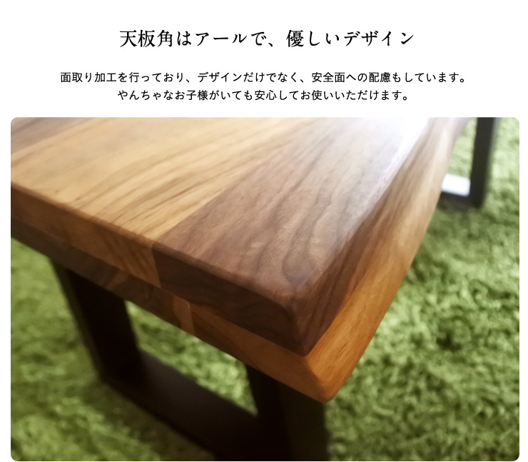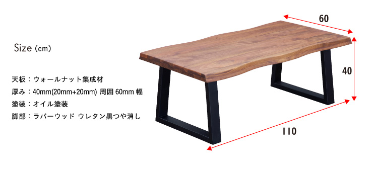 | 材質 | 材:ウォールナット無垢集成材 厚み:40mm(20mm+20mm)周囲60mm幅 塗装:オイル塗装 脚部:ラバーウッド ウレタン黒つや消し |