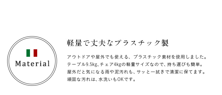 アウトドアや屋外でも使える、プラスチック素材を使用しました。テーブル9.5kg、チェア4kgの軽量サイズなので、持ち運びも簡単。屋外だと気になる雨や泥汚れも、サッと一拭きで清潔に保てます。頑固な汚れは、水洗いもOKです。