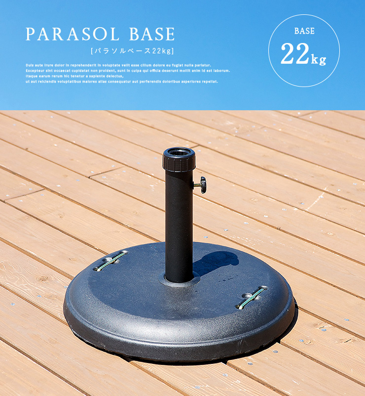 | パラソルを支える重さ22kgのベース parasol base(パラソルベース) 22kg 組立ては、パラソルを差し込んで、ネジを差し込むだけの簡単作業。 支柱が3.8~4.9cmのパラソルなら差し込むだけですぐにお使いいただけます。 ※口径キャップの付け外しで調整可能です。 ※こちらはパラソルベースのみの販売となります。 ※こちらの商品はお客様組立てとなります。 | |