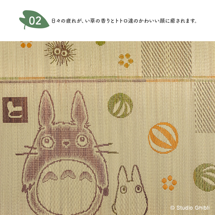| ■大人気のとなりのトトロシリーズのい草カーペットです。国産(九州産)のい草を使用しています。一本一本が太く表皮が厚く繊維がキメ細かいので弾力性があり、耐久性に優れています。 ■い草には空気の自然浄化作用、湿度の調節作用などがあります。また汚れにくく、使用するうちに黄金色に変化し味 が出ます。 ■い草に青森ヒバ加工を施しています。(抗菌、防臭効果) ■掲載写真は表記サイズとは異なる場合がございます。 | |