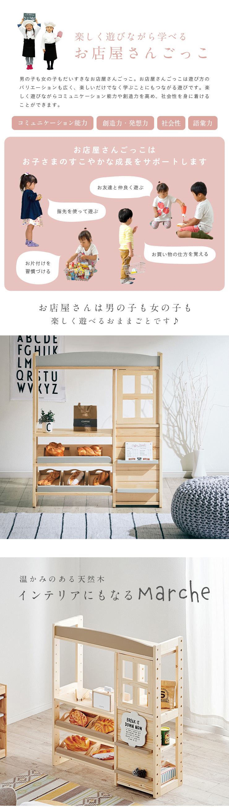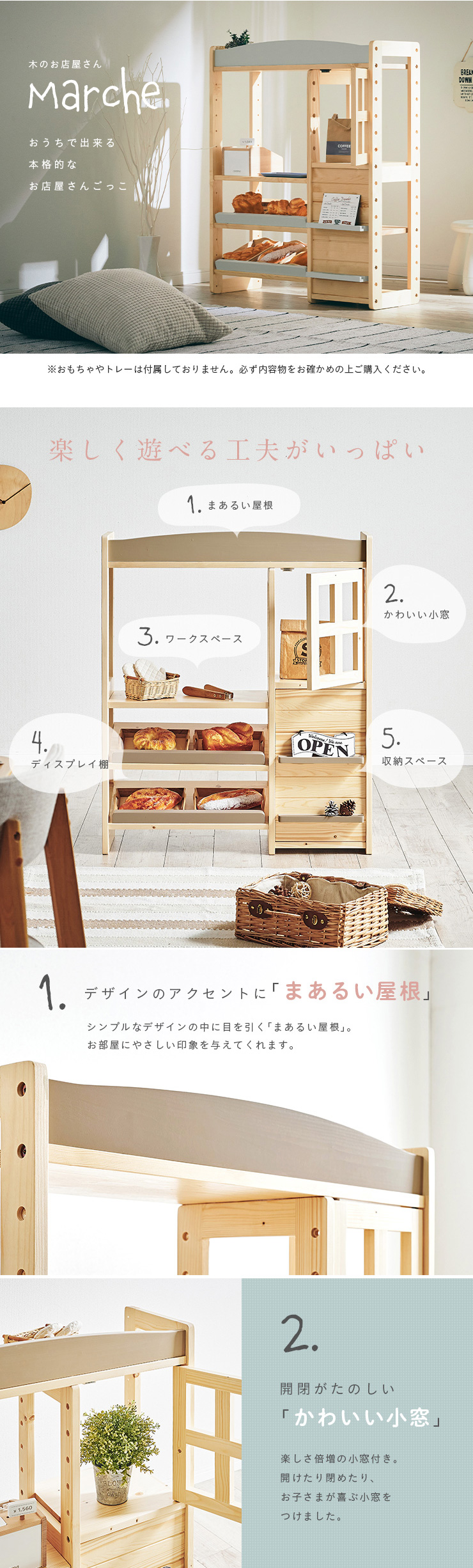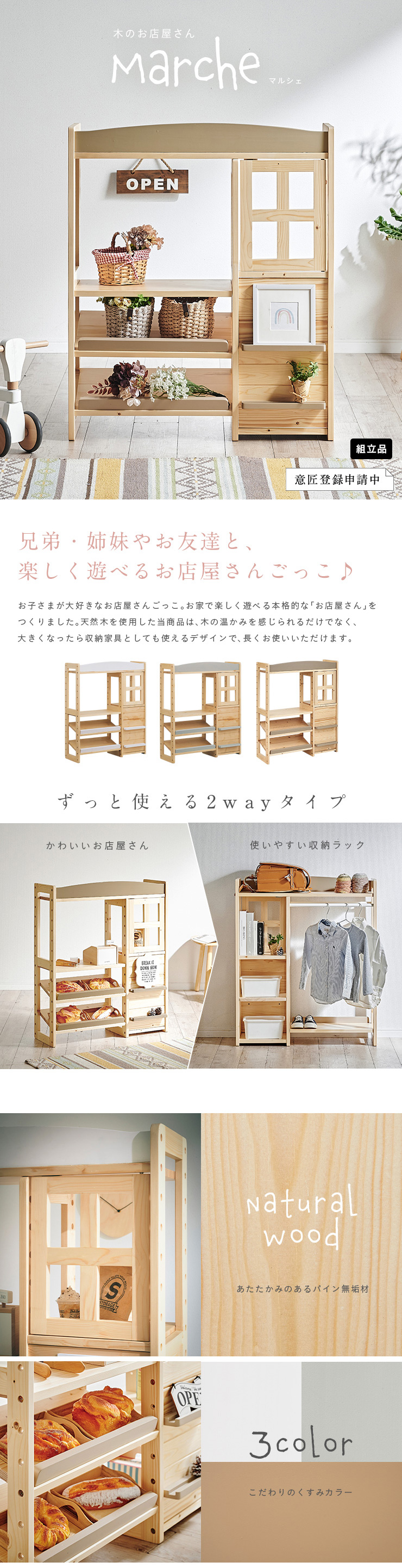 | おうちで出来る本格的な「お店屋さんごっこ」 お子さまが大好きなお店屋さんごっこ。お家で楽しく遊べる本格的な「お店屋さん」をつくりました。天然木を使用した当商品は、木の温かみを感じられるだけでなく、大きくなったら収納家具としても使えるデザインで、長くお使いいただけます。 ■まるでホンモノみたい!Marcheは楽しく遊べる工夫がいっぱい 1、デザインのアクセントに「まあるい屋根」 シンプルなデザインの中に目を引く「まあるい屋根」。お部屋にやさしい印象を与えてくれます。 2、開閉がたのしい「かわいい小窓」 品物はこちらでお渡しします♪楽しさ倍増の小窓付。開けたり閉めたり、お子さまが喜ぶ小窓をつけました。 3、広々遊べる「ワークスペース」 幅51.5/奥行き29cmのワークスペースでレジを置いたり、お料理をしたりさまざな遊びができます。 4、たくさん置ける2段の「ディスプレイ棚」 傾斜をつけることで本物のお店のようにディスプレイができるようにしました。並べるものを変えていろいろなお店屋さんごっこをたのしむことができます。 5、お片づけに役立つ「収納スペース」 小窓の下はうれしい収納スペース。遊んだあとのお片づけもこれでバッチリ。 ■楽しく遊びながら学べるお店屋さんごっこ 男の子も女の子もだいすきなお店屋さんごっこ。お店屋さんごっこは遊び方のバリエーションも広く、楽しいだけでなく学ぶことにもつながる遊びです。楽しく遊びながらコミュニケーション能力や創造力を高め、社会性を身に着けることができます。 ■温かみのある天然木を使用 インテリアにもなるMarche。パイン材の天然木でつくられたMarche。やさしい木の質感と温かみを感じられます。他のインテリアとの相性も良く、お子さまが大きくなったらインテリアとしても使えるうれしい2way仕様。部品を入れ替えるだけでハンガーラックに変身。お店屋さんごっこをしなくなった後も、ハンガーラックやランドセルラックとしてお使いいただけます。 ■colour お好みで選べる3colour パイン材のあたたかい雰囲気に合わせたポイントカラーを3色ご用意。やわらかさを出すためにくすみカラーを採用。当店こだわりのオリジナルカラーです。 ※こちらの商品はお客様組み立てとなります。 ※おもちゃやトレーは付属しておりません。 ※天然木のため節や木目の濃淡などには個体差があります。 ※塗装部分に濃淡があったり、木の収縮によって若干の隙間が出る場合があります。 ※柔らかいパイン材の性質上、小傷や擦り傷、若干の凹みなどが付きやすい製品です。 ※上記は木の性質上によるものですので、返品・交換の対象外とさせていただきますので、予めご了承ください。 ※小窓開閉部にはマグネットを使用しております。マグネットの磁気が強いと感じた場合は付属のネジ穴隠しシールや、お手持ちのセロハンテープを扉側の金属部分に貼って調節ください。 | |