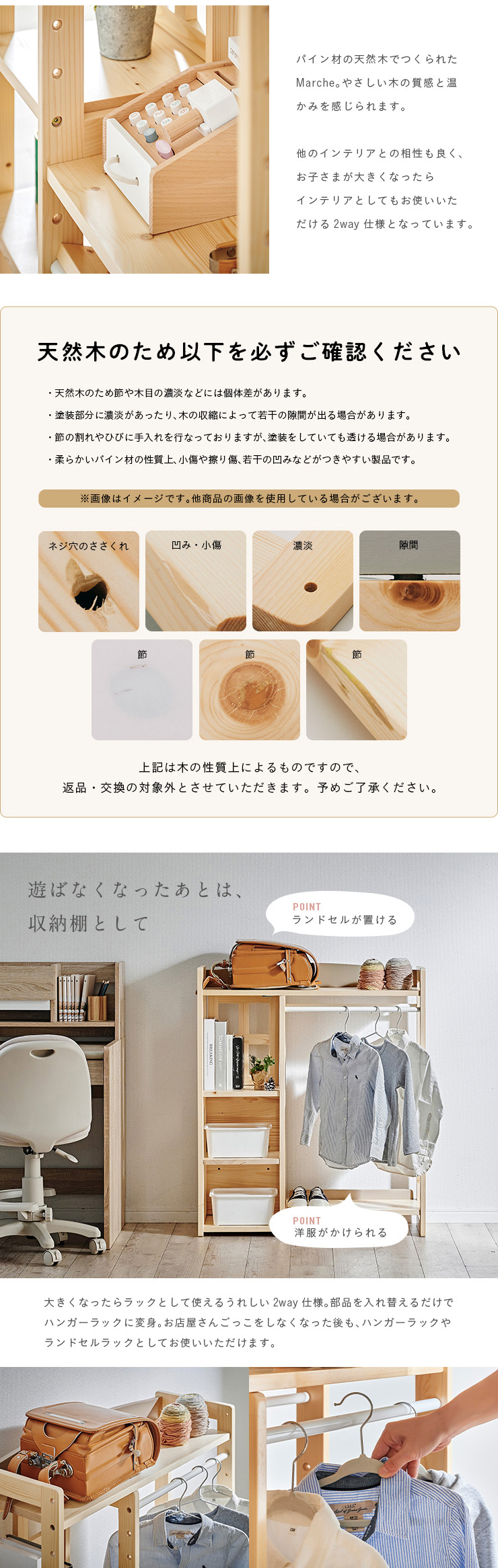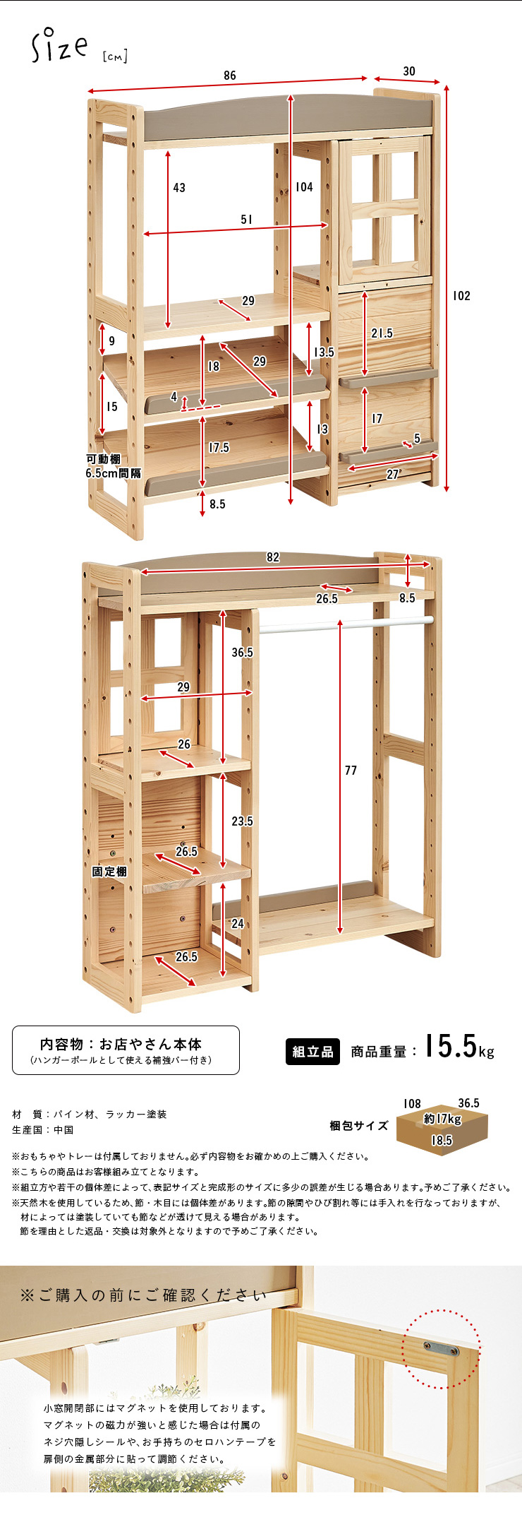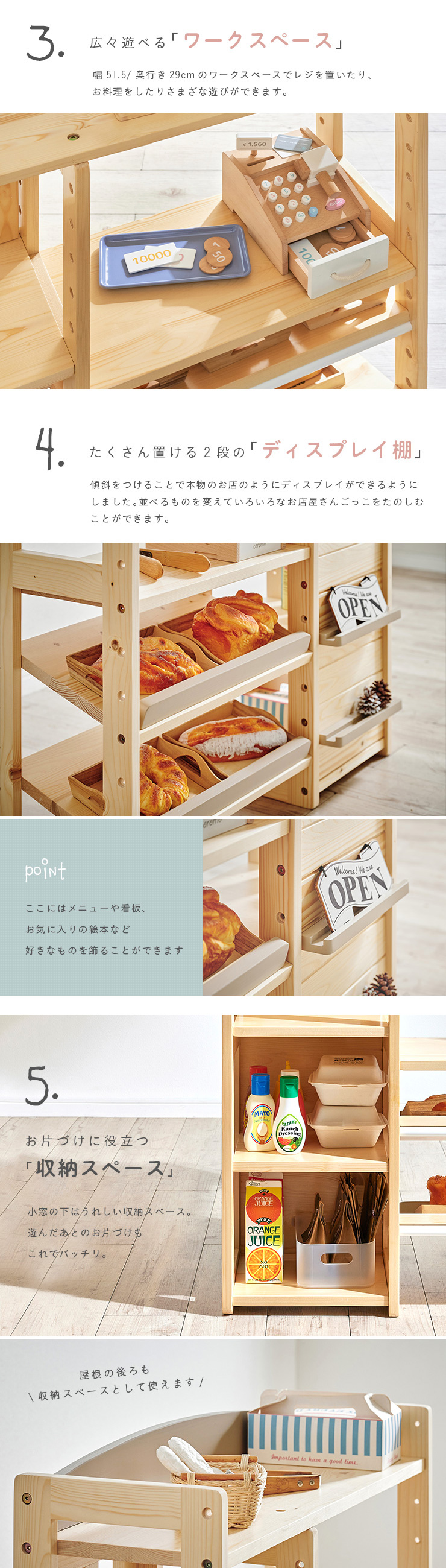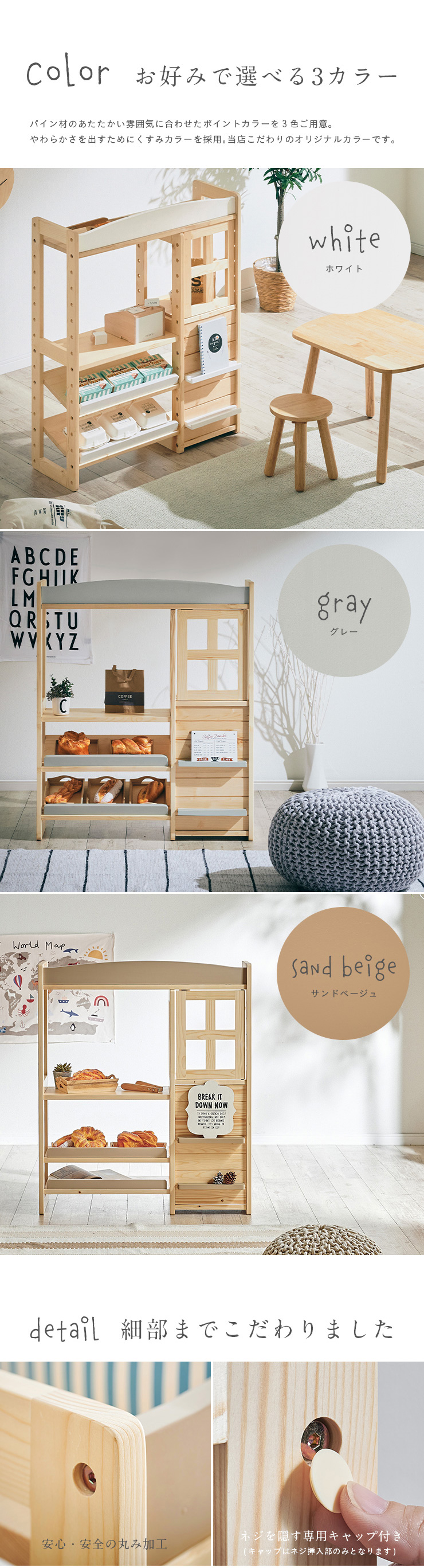 | おうちで出来る本格的な「お店屋さんごっこ」 お子さまが大好きなお店屋さんごっこ。お家で楽しく遊べる本格的な「お店屋さん」をつくりました。天然木を使用した当商品は、木の温かみを感じられるだけでなく、大きくなったら収納家具としても使えるデザインで、長くお使いいただけます。 ■まるでホンモノみたい!Marcheは楽しく遊べる工夫がいっぱい 1、デザインのアクセントに「まあるい屋根」 シンプルなデザインの中に目を引く「まあるい屋根」。お部屋にやさしい印象を与えてくれます。 2、開閉がたのしい「かわいい小窓」 品物はこちらでお渡しします♪楽しさ倍増の小窓付。開けたり閉めたり、お子さまが喜ぶ小窓をつけました。 3、広々遊べる「ワークスペース」 幅51.5/奥行き29cmのワークスペースでレジを置いたり、お料理をしたりさまざな遊びができます。 4、たくさん置ける2段の「ディスプレイ棚」 傾斜をつけることで本物のお店のようにディスプレイができるようにしました。並べるものを変えていろいろなお店屋さんごっこをたのしむことができます。 5、お片づけに役立つ「収納スペース」 小窓の下はうれしい収納スペース。遊んだあとのお片づけもこれでバッチリ。 ■楽しく遊びながら学べるお店屋さんごっこ 男の子も女の子もだいすきなお店屋さんごっこ。お店屋さんごっこは遊び方のバリエーションも広く、楽しいだけでなく学ぶことにもつながる遊びです。楽しく遊びながらコミュニケーション能力や創造力を高め、社会性を身に着けることができます。 ■温かみのある天然木を使用 インテリアにもなるMarche。パイン材の天然木でつくられたMarche。やさしい木の質感と温かみを感じられます。他のインテリアとの相性も良く、お子さまが大きくなったらインテリアとしても使えるうれしい2way仕様。部品を入れ替えるだけでハンガーラックに変身。お店屋さんごっこをしなくなった後も、ハンガーラックやランドセルラックとしてお使いいただけます。 ■colour お好みで選べる3colour パイン材のあたたかい雰囲気に合わせたポイントカラーを3色ご用意。やわらかさを出すためにくすみカラーを採用。当店こだわりのオリジナルカラーです。 ※こちらの商品はお客様組み立てとなります。 ※おもちゃやトレーは付属しておりません。 ※天然木のため節や木目の濃淡などには個体差があります。 ※塗装部分に濃淡があったり、木の収縮によって若干の隙間が出る場合があります。 ※柔らかいパイン材の性質上、小傷や擦り傷、若干の凹みなどが付きやすい製品です。 ※上記は木の性質上によるものですので、返品・交換の対象外とさせていただきますので、予めご了承ください。 ※小窓開閉部にはマグネットを使用しております。マグネットの磁気が強いと感じた場合は付属のネジ穴隠しシールや、お手持ちのセロハンテープを扉側の金属部分に貼って調節ください。 | |