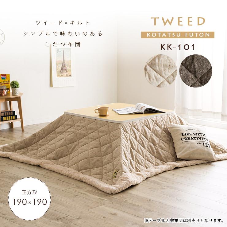 | 薄掛けコタツフトン 正方形 ツイード KK-101 190×190 正方形タイプ ツイード生地×キルトでシンプルながらも味わいのあるコタツ布団 ツイード生地とキルトで味わいのある質感を出し、お部屋に自然に溶け込むデザイン。ふかふかのシープボアのふちどりが可愛らしいアクセント。 ■こだわりのデザイン 表は質感のあるツイード生地、裏地は暖かくフリースのような心地よい肌触りの生地を使用。ふちどりはふわふわとしたシープボアで仕上げました。可愛らしい刺繍タグ付き。裏地は手触りのよい生地を使用。 ■薄がけタイプでお部屋スッキリ 軽くふんわりした薄がけタイプなのでシルエットもスッキリ。もちろん薄がけでも暖かさはバッチリです。 ■エコで経済的なこたつ 01..おさいふに優しい こたつはエアコンや石油ストーブに比べ電気代がかからずとっても経済的。一人暮らしで電気代を節約したい!という方にもおすすめです。 02..地球に優しい 電気こたつはCO2の発生量も少ない為、エコな暖房と言われています。 ■便利な収納袋付き 収納袋にいれてお届けします。収納袋があれば、シーズンオフでも場所をとらずにキレイに収納できるのがうれしいですよね。 ※収納袋のサイズは変更になる場合がございます。予めご了承ください。 ※こちらはこたつ掛け布団単品での販売となります。こたつ本体、敷き布団等は別売りとなりますのでご注意ください。 | |