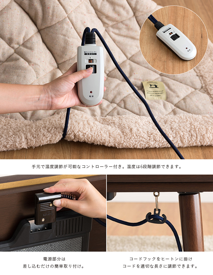 | フラットヒーターコタツテーブル KT-303 天板サイズ 105×75cm 足元の空間広々な薄型フラットヒーターコタツテーブル。 シンプルモダンなデザインと天然木の木の風合いがお部屋に馴染むデザイン。薄型ヒーターなのでオフシーズンは通常のリビングテーブルと同じようにお使いいただけます。 ■heater 足元が広々使える薄型のフラットカーボンヒーターを採用。 ヒーターの面積が広いのでこたつの中をムラなく均一に温めます。カーボンヒーターは通常の電熱線ではなく電熱版を使用している為、断線の心配がありません。また高純度のカーボン版によって遠赤外線効果も期待できます。フラットヒーターで足元の空間を広々お使いいただけます。オフシーズンもヒーターが目立たないのがうれしいですね。 ■Table 自然の風合い溢れる天然木がモダンながらもお部屋を温かみのある雰囲気に。天板が落ちたり傾きにくい2重天板仕様。木の風合いは残したままハイレベルなUV塗装で使い勝手のよい天板に仕上げました。中天板を天板と同じ形にすることで、天板がずれても落ちたり傾いたりするのを防ぐ効果があります。 ■function 脚を取り付けるだけの簡単組み立て、操作しやすいコントローラーでさらに使いやすさアップ。手元で温度調節が可能なコントローラー付き。温度は6段階調節できます。 ■eco & economy エコで経済的なこたつ 01..おさいふに優しい こたつはエアコンや石油ストーブに比べ電気代がかからずとっても経済的。一人暮らしで電気代を節約したい!という方にもおすすめです。 02..地球に優しい 電気こたつはCO2の発生量も少ない為、エコな暖房と言われています。 ■1年保証 保証期間はお買い上げ日から1年間です。なお保証期間中でも有料になることがありますので、保証書をよくお読みください。 | |