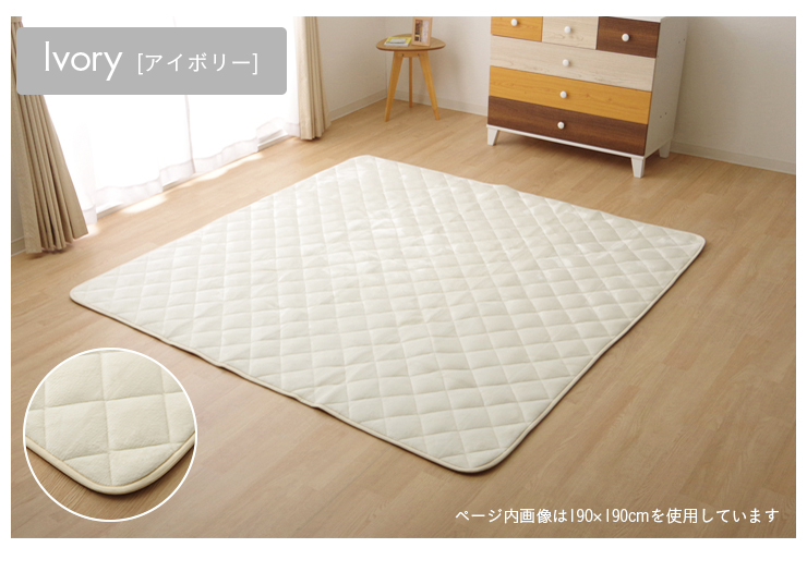 | ■中わたに抗菌防臭加工を施した無地のキルトラグカーペットです。 ■表地には柔らかく、肌触りの良いフランネル生地を使用してます。毛足が短いので掃除機もかけやすく、毛足にゴミや埃が絡みにくいという特長もあります。 ■フローリングを傷つけにくいよう、裏には不織布を貼っています。またすべりにくい加工も施しておりますので、フローリングでも安心してご使用頂けます。 ■中材にはウレタン10mmを使用しておりますので、適度なボリュームとクッション性があります。 ■また、表地の素材が同じで同色のコタツ掛け布団も別途取扱いがありますので、トータルでのコーディネートもおすすめです。 ■コタツ敷布団、ホットカーペットカバーにも適しています。床暖房にも対応しています。 ■※本商品は圧縮梱包でのお届けとなります。商品が届きましたらお早めに開梱して頂き、2~3時間日陰干しをして頂くと復元が早まります。 ※写真は表記サイズと異なる場合がございます。 ◆洗濯表示◆40℃以下の水温で弱い手洗いがよい。中性洗剤をご使用下さい。(洗濯機の使用はできません。) 干し方=日陰のつり干しがよい。 ※洗濯後は、表面の風合いの変化や多少の縮みなど、形状の変化が発生する場合があります。ご了承下さい。 | |