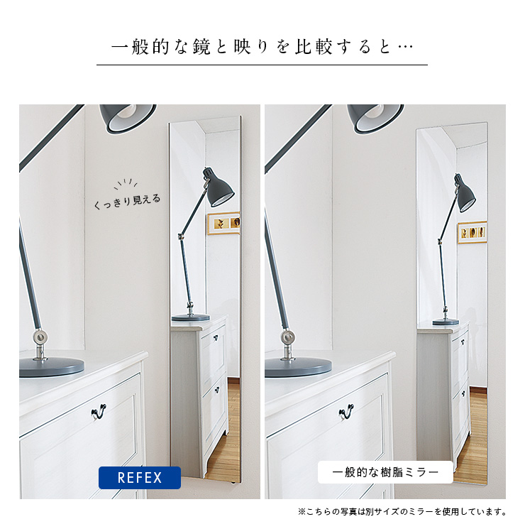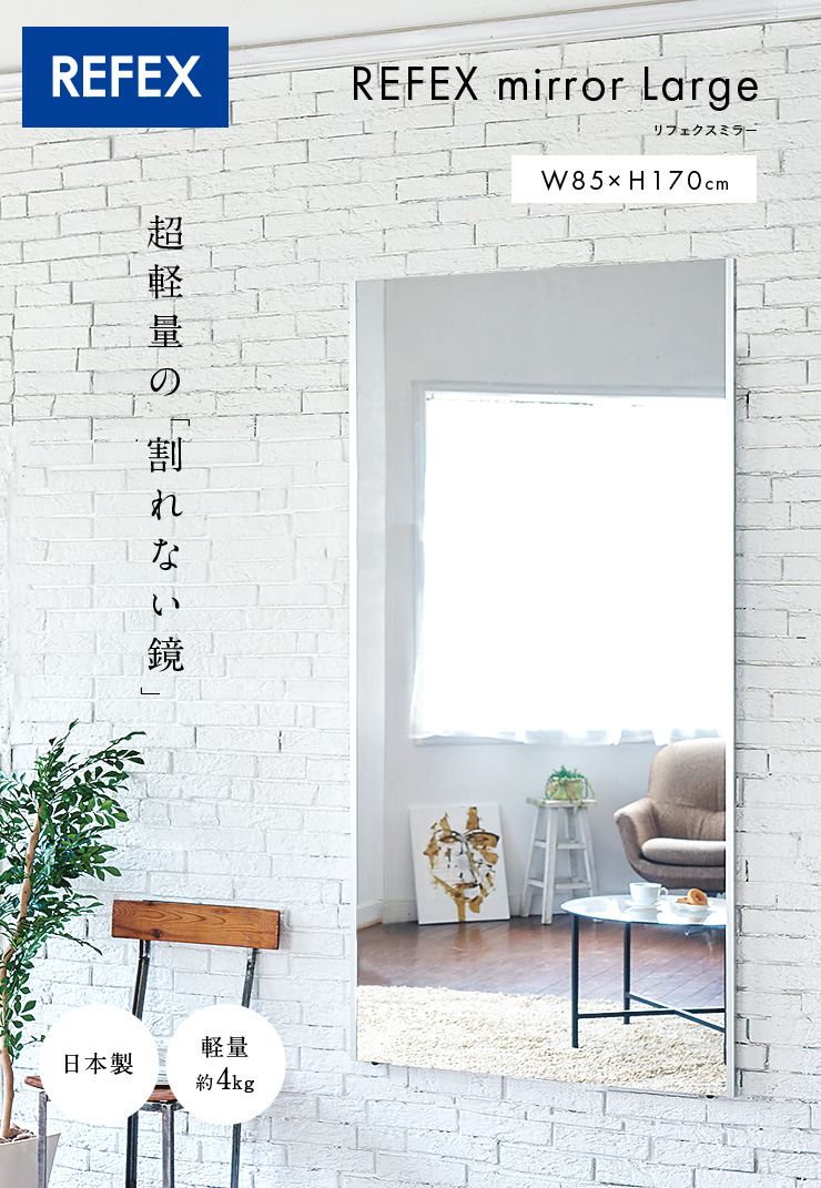 | 超軽量の「割れない鏡」 REFEX mirror Large W85×H170 (リフェクスミラー) ガラスを使っていないミラーだから、安心・安全 極薄のポリエステルフィルムを採用した割れない鏡、リフェクスミラー。一般的なガラス鏡と比べ、とっても軽量で女性の方やお子さまでもラクに持ち運ぶことが出来ます。倒れたり、物がぶつかっても割れることがないので安全。身だしなみチェックとしてのご使用はもちろん、ダンスの練習やヨガのフォームチェックの際にもお使いいただける、日本製の軽量ミラーです。 危険が潜む鏡からは卒業しませんか? 一般的なガラスを使用した通常の姿見は、不意に倒れて割れたり、物がぶつかって割れたり、と危険がいっぱい。さらに、ガラスの破片の散らばりによるケガを引き起こしてしまう恐れも...小さなお子さまがいらっしゃるご家庭では、特に心配ですよね。 ■『そんな時、リフェクスミラーなら』 ガラスではなく、極薄のポリエステルフィルムを使用しているので、倒れても安心。ボールが当たったり、お子さまがぶつかっても割れる恐れがありません。 ※フィルムですので、鋭利な物で突き刺すと破れることがあります。 ■リフェクスミラーとは? ・ガラス鏡の約5分の1の軽さ ・割れないので安心・安全 ・ガラス鏡より鮮明かつ自然 ■シンプルなシルバーの枠 枠はシルバーの15mmタイプ。シンプルで、目立ちにくいカラーの枠です。 ■安心の日本製 リフェクスミラーは、安心の日本製。国内の工場で熟練した職人が、1枚1枚丁寧に手作業で仕上げています。 ■リフェクスミラーの使い方 とっても軽量のリフェクスミラーは、付属のチェーンで簡単に壁に吊り下げることが出来ます。表からチェーンが見えないので、見た目もスマート。また、ゴム脚付きなので壁に立てかけて使ってもOK。市販のフックが取り付けられる壁であれば設置が可能です。 ※ご注意ください ・リフェクスミラーは中空張りのパネルなので、鋭利な物で突き刺すと破れることがあります。 ・直射日光のあたるところ、湿気の多いところでの使用、保管は避けてください。 ・運搬時は鏡面を傷つけないようご注意ください。 ・保管時は平積みを避け、立てかけて保管してください。 ・空調機の風が至近距離で当たる場所での使用、保管は避けてください。 ・軽い汚れは、付属の専用クリーナークロスでやさしく拭いてください。その他の布で拭くと、傷が付く恐れがあります。 ・汚れのひどい部分は、中性洗剤薄め液をご使用ください。 ・表面はポリエステルフィルムのため、溶剤の使用は厳禁です。また、研磨剤が混入しているクリーナーも傷の原因になりますので、ご使用はお控えください。 ※鏡底部の滑り止めのゴムが不要な場合は、プラスドライバーでゴムを止めているビスをゆるめて、ゴムを取り外してください。 | |