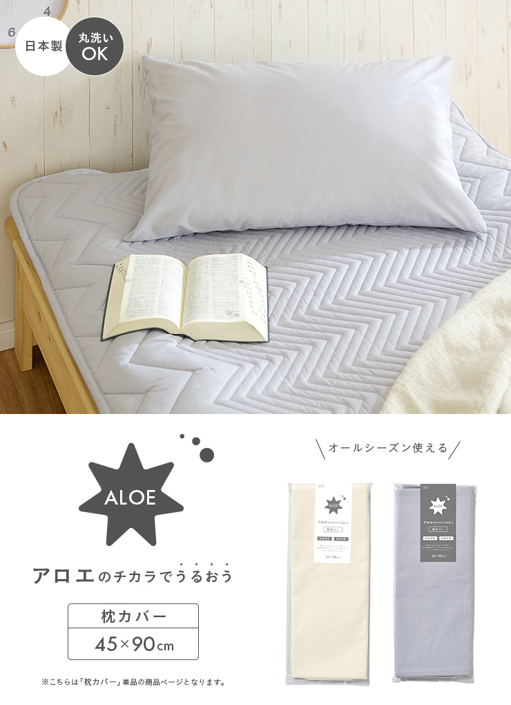 | アロエのチカラでうるおう 枕カバー 45×90cm お肌にやさしい寝具をつくりました 肌や髪にうるおいを与える「アロエ成分」と、帯電や摩擦を軽減する「キトサン成分」を含んだ特殊な仕上げ剤を使用した肌思いの寝具をつくりました。信頼ある日本製で、毎日安心してお休みいただける枕カバーです。 ■うるおいたっぷり、アロエ・キトサン加工 「アロエ成分」と「キトサン成分」を含んだ特殊な機能性仕上げ剤で生地をつくった「うるおう寝具」。乾燥や静電気でお悩みの女性やお子さまにおすすめ。毎日肌に触れることを考え、天然素材を使った安全性の高い原料を使用しています。 ■1年通して使えるカバーです ポリエステルと綿をつかったつるっとした肌触り生地。お手入れがしやすい素材で、季節を問わず1年中お使いいただけます。 ■手洗いOK ウォッシャブル仕様 手洗いでお洗濯が可能な洗えるカバー。毎日使うものだから、清潔に使えるものを選びたいですよね。 ■封筒式で簡単に着脱できます 枕の幅に左右されない、封筒式の枕カバーです。着脱の方法はとっても簡単。枕本体をカバーにいれて余った部分は内側に織り込むだけ。あとは枕本体に合わせて幅を微調整するとキレイに仕上がります。 ■安心して使える日本製 当商品は信頼ある国産品。日本が誇る、品質へのこだわりを実感できる商品です。布団は直接肌に触れ、毎日使用するものなので、安心感のある日本製はうれしいポイント。 ■インテリアに合わせやすいシンプルな無地タイプ。 カラーは清潔感のあるアイボリー、シックなグレーとの2colorよりお選びいただけます。 ※こちらは「枕カバー」単品の商品ページとなります。 | |