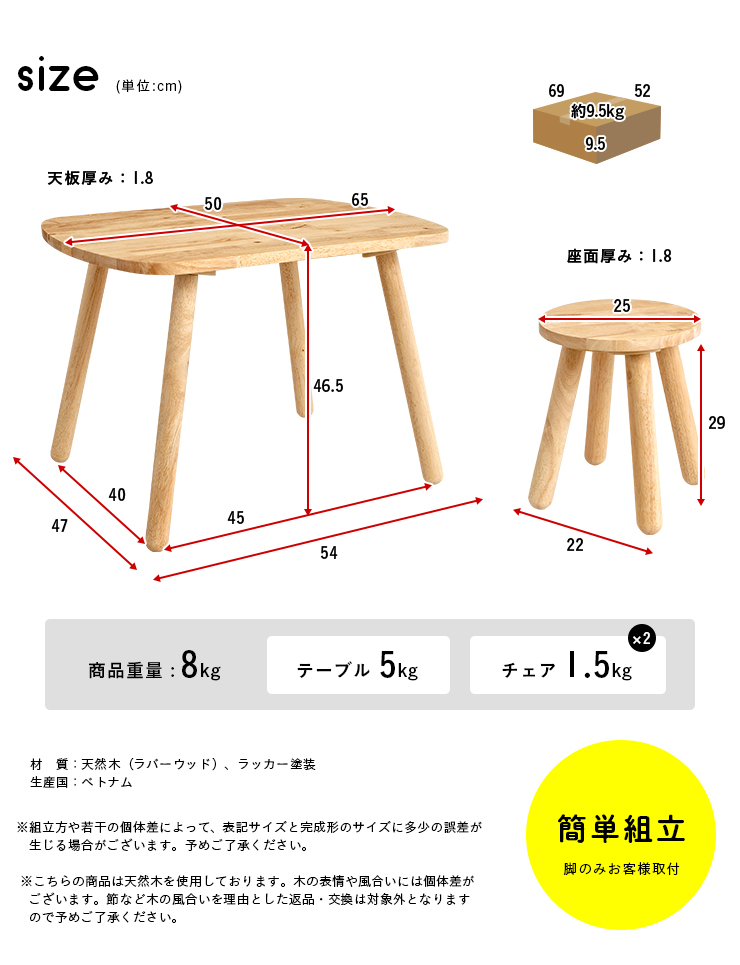 | はじめてのテーブル&チェア Kids table chair set ninos(ニノス) みんなで楽しく使えるテーブル+スツール2脚の3点セット お友達や兄弟と仲良く使える大きさのテーブルにスツールを合わせたキッズテーブルセット。お子さまが安心して使えるよう、危険な角にはすべて丸みを施し、やさしい印象に仕上げました。なめらかな肌触りと天然木の持つ優しいぬくもりが魅力なラバーウッド素材。木の温かみを活かしたナチュラルカラーは、子供部屋はもちろん、ご家庭のリビングにもぴったり。 ■コンパクトで使いやすい大きさ テーブルは、幅65×奥行50cmとコンパクトながらもお子様2人でも楽しく使える大きさです。2脚のチェアはスツールタイプなので、使わない時は、テーブルの下に入れて収納することができます。おやつを食べたり、お絵描きをしたり、様々なシーンで大活躍。 ■お部屋に合わせやすいシンプルデザイン あたたかみを与えてくれる、ラバーウッドの質感と丸みをおびたデザイン。シンプルなデザインなので、子供部屋はもちろん、リビングにも馴染みます。 ■やわらかい印象のラバーウッド なめらかな肌触り、やわらかい木目が特徴のラバーウッド。天然ゴム採取後に伐採されるゴムの木を再利用した、環境にやさしいエコ素材です。淡いナチュラル色のやさしい色合いが、お部屋にあたたかみを与えてくれます。 ■安心・安全の角丸加工 大切なお子さまが使うものだから、危険は取り除きたいという声にお応えして、角にはすべて丸み加工を施しました。安心して使えるとともに、やさしい印象を与えてくれます。 ■工具不要の簡単組み立て テーブルもスツール共に、組み立ては脚をくるくる回して取り付けるだけの簡単組立。組み立てが苦手な女性の方もこれなら安心ですね。 ※こちらの商品は天然木を使用しております。木の表情や風合いには個体差がございます。節など木の風合いを理由とした返品・交換は対象外となりますので予めご了承ください。 ※組み立て方や若干の個体差によって、表記サイズと完成形のサイズに多少の誤差が生じる場合がございます。予めご了承ください。 ※脚のみお客様取り付けとなります。 | |