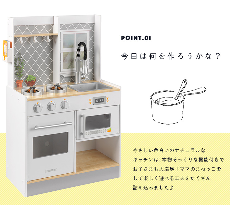 | 音と光で楽しむ新しいキッチン KidKraft バーナー付きプレイキッチン ジュージュー!リアルな音でおままごとをもっと楽しく。 コミュニケーション能力や創造力などを育むおままごとは、お子さまの成長に欠かせない遊びです。「KidKraft バーナー付きプレイキッチン」は本物そっくりな機能と、やさしい色合いのナチュラルデザインが魅力。光ったり音が鳴ったりするキッチンで、楽しくお料理をはじめよう。 Point.01 今日は何を作ろうかな? やさしい色合いのナチュラルなキッチンは、本物そっくりな機能付きでお子さまも大満足。ママのまねっこをして楽しく遊べる工夫をたくさん詰め込みました。 Point.02 安全・安心のCEマーク ヨーロッパ(EU)における法的規則に対する適合性表示マークである「CE」の認定を受けています。日本製品の安全基準より高いとも称されるCEマークの製品の安全性は、認定機関による厳格な試験で証明されています。 ※ご注意 ・誤飲・窒息の危険がありますので、3歳未満のお子さまには絶対に与えないでください。 ・製品の転倒、落下によるけがなどの危害を軽減するために、転倒防止金具をお使いください。 ・小さな部品があります。口の中に絶対に入れないでください。窒息の危険があります。 ・必ず保護者の元で遊ばせてください。 ・開封後、製品が組み立てられていない状態では先端や縁が鋭く、けがをする危険性のある部品が含まれています。組み立て前の部品をお子さまに与えないでください。 ・お子さまが製品に乗ったり、中に入らないようにご注意ください。製品が倒壊したり転倒やけがの原因になります。 ・組み立てた製品は定期的に点検し、金具は必要に応じて締め直してください。 ・本製品は木製で手作業により塗装された部材があるため、多少の色むらや表面・角のめくれが見られる場合がございます。 ・電池交換の際はボタン電池(LR44/AG13)が6個必要です。 ・電池の交換は必ず大人の方が行ってください。 ・電池の交換にはプラスドライバーが必要です。 ・長期間使用しない時は電池を取り出しておいてください。 ※こちらの商品はお客様組み立てとなります。 ※スマートフォン以外の小物類(調理器具や食べ物等)は付属しておりません。 | |