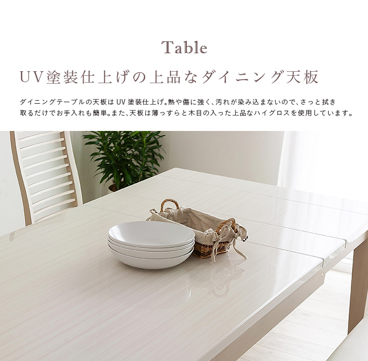 | 清潔感のある明るいAbby(アビー)ダイニング4点セット 伸長式テーブルのダイニング4点セット UV塗装仕上げが美しい、伸長式のダイニングセットAbby。 傷や汚れに強く、最大180cmまで伸長できるテーブルに、ゆったりとくつろげるハイバックチェアと、使い勝手のいいベンチを合わせたダイニング4点セットです。 ■Table:UV塗装仕上げの上品なダイニング天板 ダイニングテーブルの天板はUV塗装仕上げ。熱や傷に強く、汚れが染み込まないので、さっと拭き取るだけでお手入れも簡単。また、天板は薄っすらと木目の入った上品なハイグロスを使用しています。 ■Table:幅180cmまで伸長するダイニングテーブル テーブルの天板内部に収納された拡張用の2種類のパーツを天板に乗せることで、テーブルの幅を130、150、160、180cmの4段階に簡単に伸張することが出来ます。 ■Table:角を丸くした安全な設計 テーブル天板の角は丸く加工しています。拡張用の天板も同様に加工しており、安心してお使いいただけます。 ■Chair:ゆったりくつろげるハイバックチェア 背中を沿うようにカーブを施した、高さのあるハイバックの背もたれに、肉厚のクッションで座り心地の良い座面。上品でくつろげるダイニングチェアに仕上げています。 ・背中全体を支えてくれる高さのある背もたれ ・座面は汚れやシミに強いPVC張り地を使用 ■Bench:幅110cmの広々としたベンチ 使い勝手の良いベンチは大人2名が座れる幅110cm。背もたれが無いので開放感もあり、使わない場合はテーブル下に収納できます。 ・ベンチもチェアと同様に、座面は汚れやシミに強いPVC張り地を使用 | |