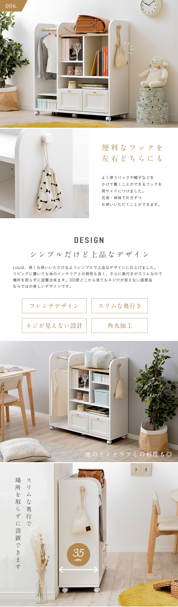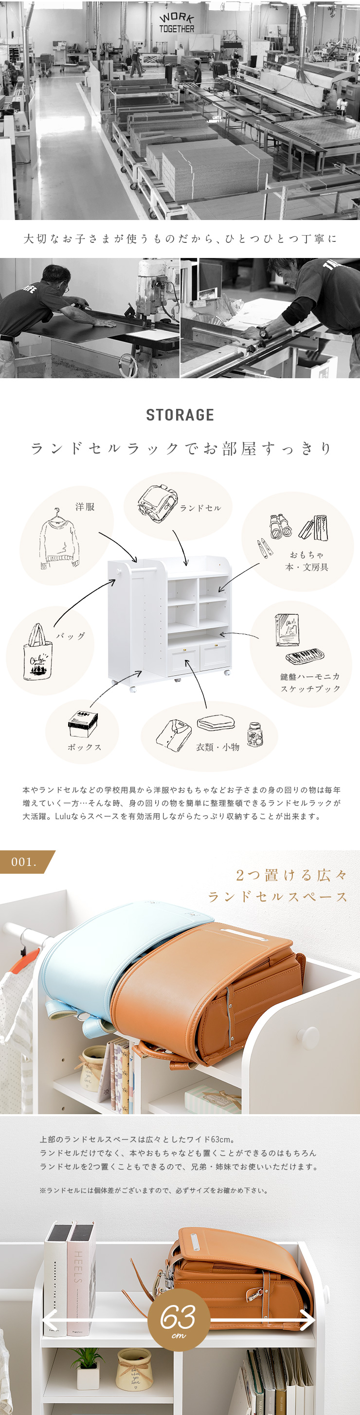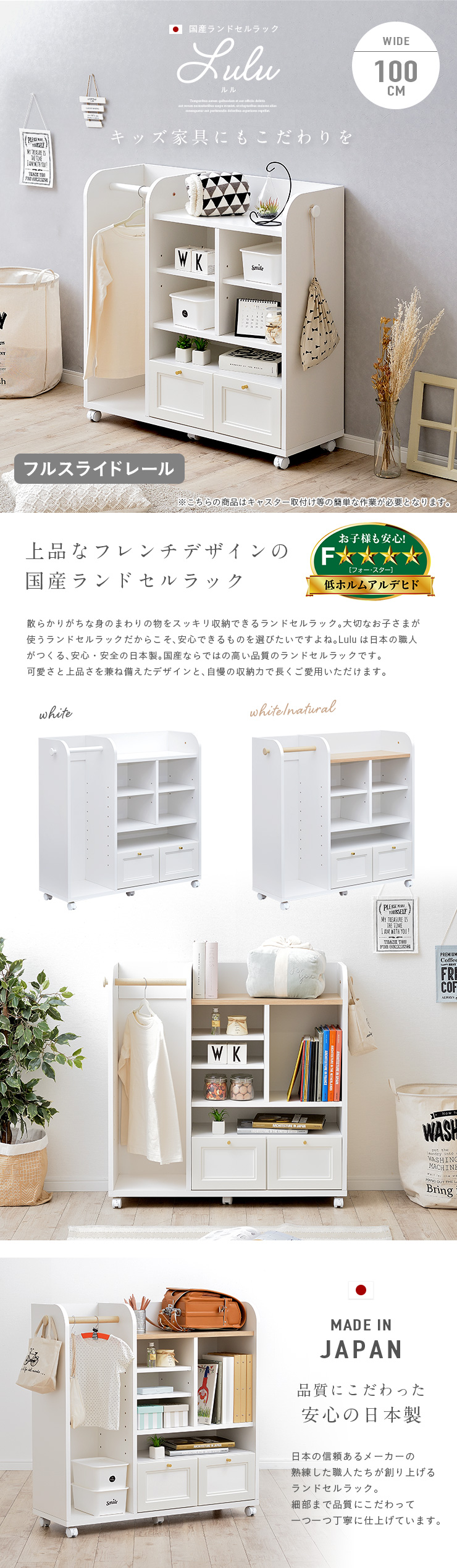 | キッズ家具にもこだわりを 国産ランドセルラック Lulu(ルル) 100cm 上品なフレンチデザインのランドセルラック 散らかりがちな身のまわりの物をスッキリ収納できるランドセルラック。大切なお子さまが使うランドセルラックだからこそ、安心できるものを選びたいですよね。Luluは日本の職人がつくる、安心・安全の日本製。国産ならではの高い品質のランドセルラックです。可愛さと上品さを兼ね備えたデザインと、自慢の収納力で長くご愛用いただけます。 ■Made in Japan 品質にこだわった安心の日本製 日本の信頼あるメーカーの熟練した職人たちが創り上げるランドセルラック。細部まで品質にこだわって、一つ一つ丁寧に仕上げています。 ■Storage ランドセルラックでお部屋すっきり 本やランドセルなどの学校用具から洋服やおもちゃなどお子さまの身の回りの物は毎年増えていく一方...そんな時、身の回りの物を簡単に整理整頓できるランドセルラックが大活躍。Luluならスペースを有効活用しながらたっぷり収納することが出来ます。 001..2つ置ける広々ランドセルスペース 002..衣類をサッとかけられるハンガーポール付き 003..スペースを有効活用できる可動棚 004..幅のあるものを収納出来るワイドスペース 005..たっぷり収納出来る2杯の引き出し 006..便利なフックを左右どちらにも ■Design シンプルだけど上品なデザイン Luluは、長くお使いいただけるようシンプルで上品なデザインに仕上げました。リビングに置いても他のインテリアとの相性も良く、さらに奥行きがスリムなので場所を取らずに設置出来ます。360度どこから見てもネジ穴が見えない、国産品ならではの美しいデザインです。 ■Useful Point Point01..ストッパー付きキャスターで固定も移動も思いのままに Point02..ママでもできる簡単組み立て ■フルスライドレール付きでより快適に ※こちらの商品はキャスター取付け等の、簡単作業が必要となります。 | |
