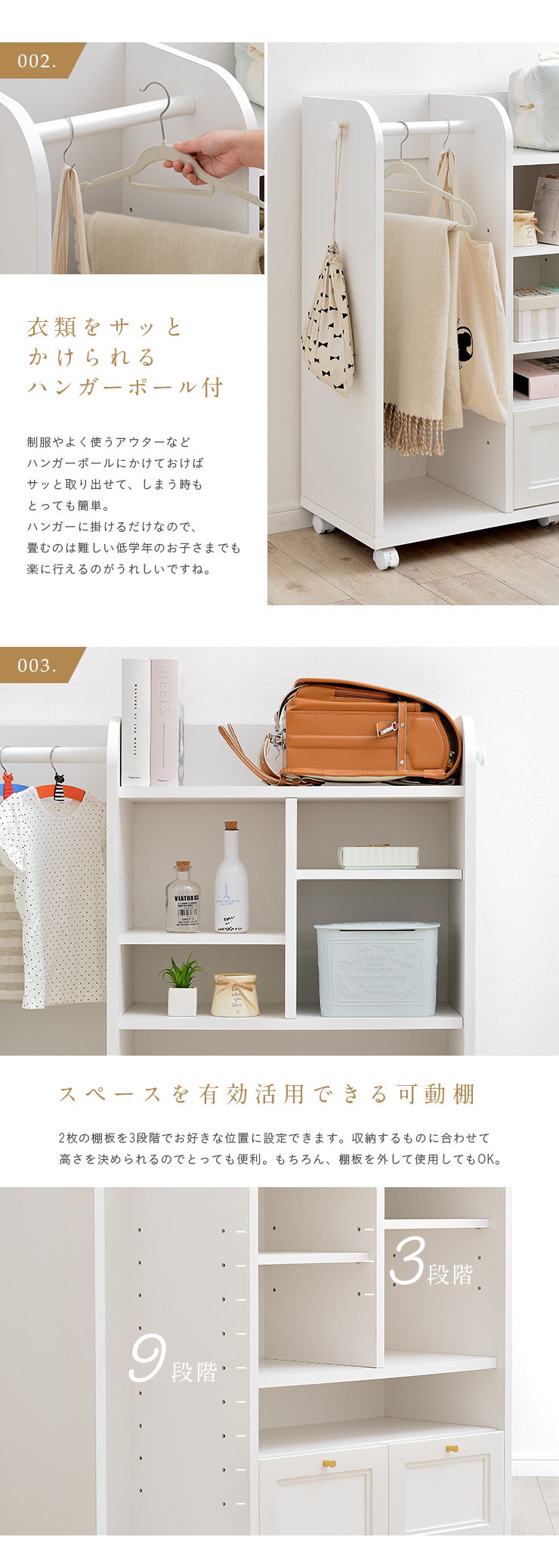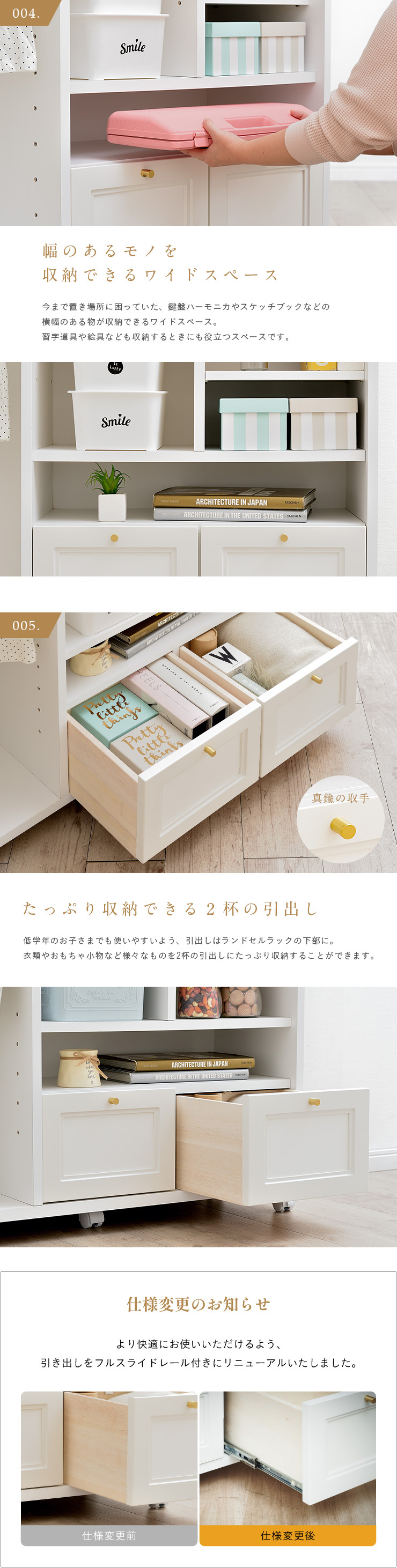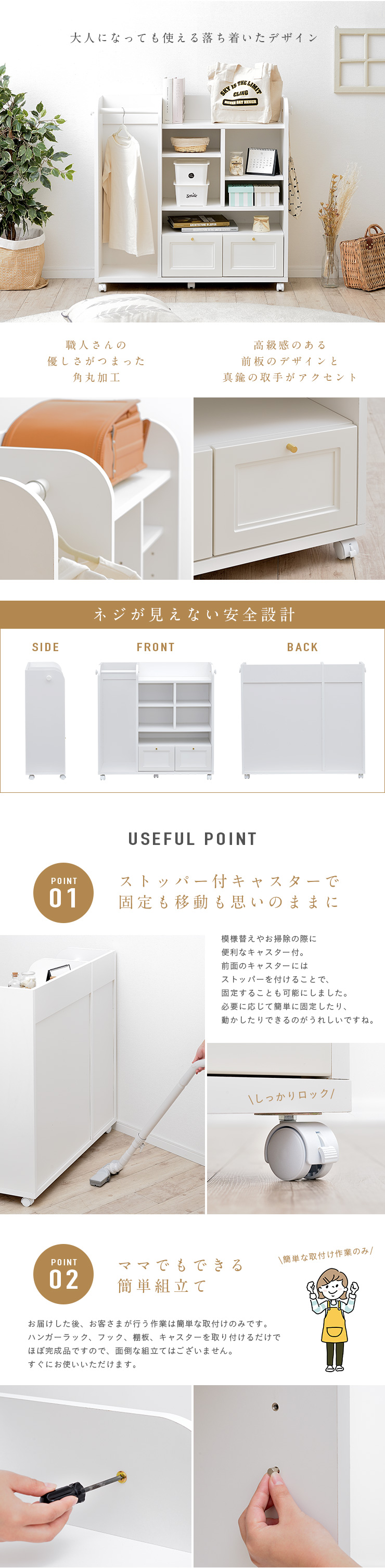 | キッズ家具にもこだわりを 国産ランドセルラック Lulu(ルル) 100cm 上品なフレンチデザインのランドセルラック 散らかりがちな身のまわりの物をスッキリ収納できるランドセルラック。大切なお子さまが使うランドセルラックだからこそ、安心できるものを選びたいですよね。Luluは日本の職人がつくる、安心・安全の日本製。国産ならではの高い品質のランドセルラックです。可愛さと上品さを兼ね備えたデザインと、自慢の収納力で長くご愛用いただけます。 ■Made in Japan 品質にこだわった安心の日本製 日本の信頼あるメーカーの熟練した職人たちが創り上げるランドセルラック。細部まで品質にこだわって、一つ一つ丁寧に仕上げています。 ■Storage ランドセルラックでお部屋すっきり 本やランドセルなどの学校用具から洋服やおもちゃなどお子さまの身の回りの物は毎年増えていく一方...そんな時、身の回りの物を簡単に整理整頓できるランドセルラックが大活躍。Luluならスペースを有効活用しながらたっぷり収納することが出来ます。 001..2つ置ける広々ランドセルスペース 002..衣類をサッとかけられるハンガーポール付き 003..スペースを有効活用できる可動棚 004..幅のあるものを収納出来るワイドスペース 005..たっぷり収納出来る2杯の引き出し 006..便利なフックを左右どちらにも ■Design シンプルだけど上品なデザイン Luluは、長くお使いいただけるようシンプルで上品なデザインに仕上げました。リビングに置いても他のインテリアとの相性も良く、さらに奥行きがスリムなので場所を取らずに設置出来ます。360度どこから見てもネジ穴が見えない、国産品ならではの美しいデザインです。 ■Useful Point Point01..ストッパー付きキャスターで固定も移動も思いのままに Point02..ママでもできる簡単組み立て ■フルスライドレール付きでより快適に ※こちらの商品はキャスター取付け等の、簡単作業が必要となります。 | |