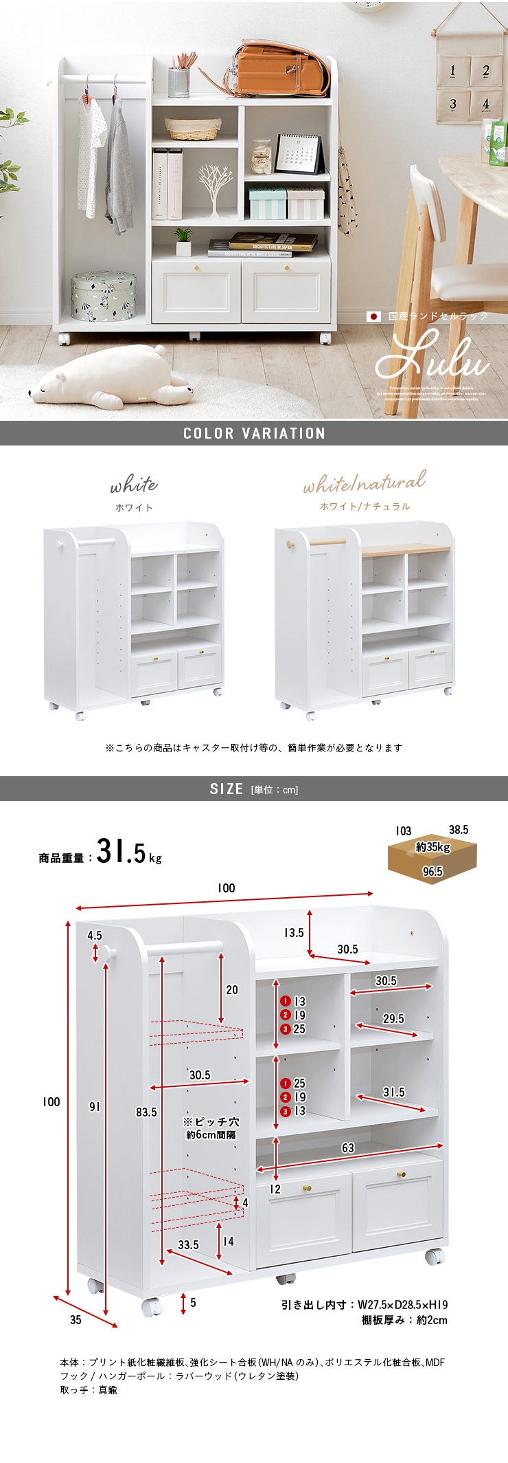| 材質 | 本体:プリント紙化粧繊維板、強化シート合板(WH/NAのみ)、ポリエステル化粧合板、MDF フック/ハンガーポール:ラバーウッド ウレタン塗装 取っ手:真鍮 |