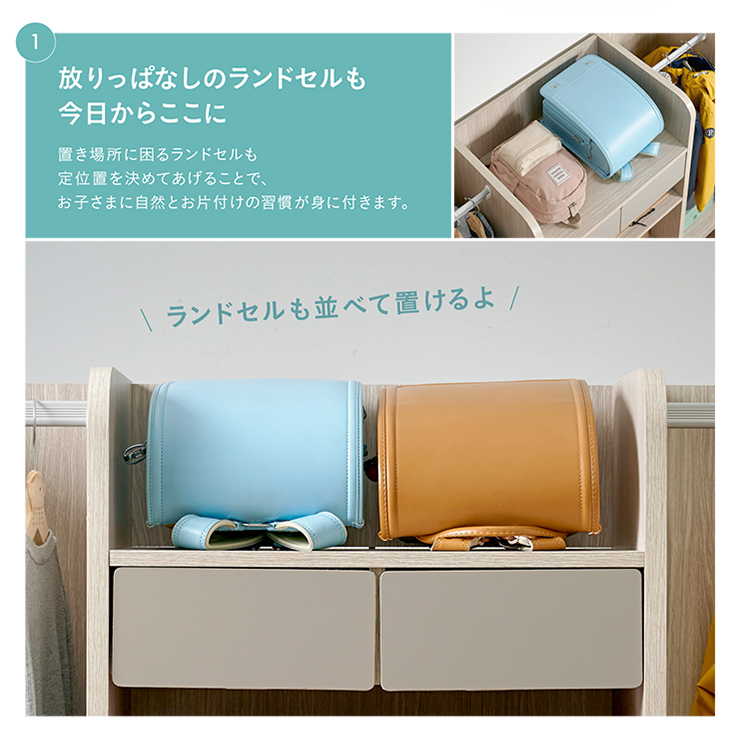 | 必要なものは全部ここに 124ランドセルラック Halo Twin(ハロ ツイン) ■storage 大容量収納で明日の準備もラクラク ランドセルなどの学校用品はもちろん、習い事の道具や衣類や小物様々なものを収納できるHalo。 身の回りのものを一か所に集める事で明日の準備もラクラク。 定位置を決めてあげることで整理整頓を身に着けることができます。 ツインタイプだから、兄弟で一緒にお使いいただけます。 ■design リビングにも置けるシンプルデザイン 子供部屋はもちろんリビングにも置ける、シンプルなデザインに仕上げました。 お子さまが使いやすいよう高さを抑えた89.5cmで圧迫感を感じさせず、他のインテリアとの相性も◎。 お子さまが成長してからもお使いいただけるデザインです。 ■Color お部屋のコーディネートがしやすい、木目調×くすみカラー カラーは全3色。部屋馴染みの良い木目調と淡いくすみカラーを合わせました。お子さまの好みに合ったカラーが選べます。 ■function お掃除もラクラク隠しキャスター ほこりが溜まりがちなラックの後ろもキャスター付ならお掃除ラクラク。 成長と共にリビングから子供部屋に移動したい! そんな時もキャスター付だからスイスイ動かすことができます。 見た目はスッキリとした隠しキャスターなのがいいですね。 ■safety お子さまの安全を第一に考えて 子どもが毎日安心して使えるデスクにしたい。そんなママ達の思いをカタチにしました。 丸みのある優しいデザイン ・突起のないフラットな設計 ※お客様組み立てとなります。 | |