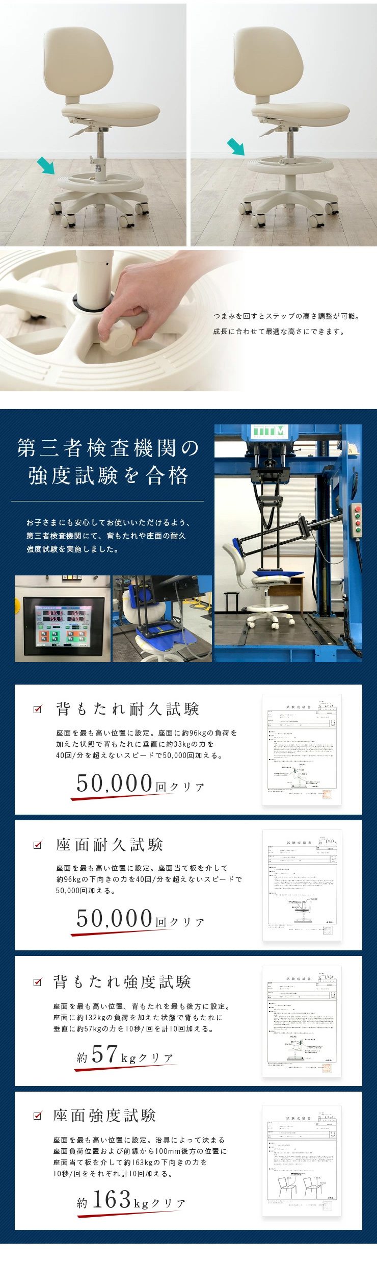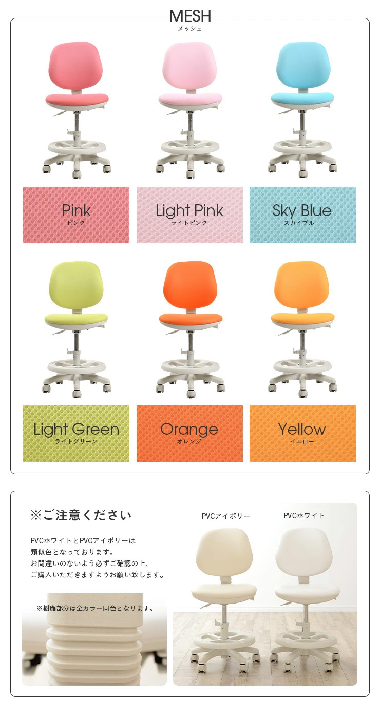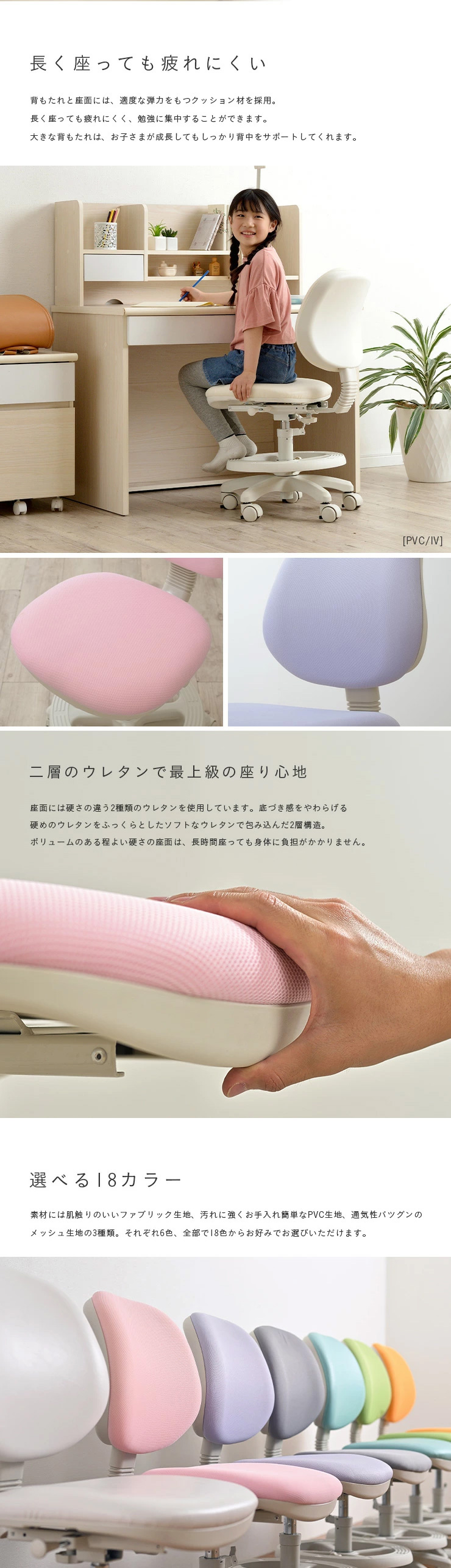 | 学習チェア Swan(スワン) 明るいホワイト樹脂の学習チェアSwan。 座面の高さ調整機能や荷重ロックなど、お子様が快適に机に向かえる工夫をふんだんに加えました。生地には肌触りのいいファブリック生地、汚れに強いPVC生地、通気性に優れたメッシュ生地の3種類からお選びいただけます。計18色の豊富なカラーバリエーションで、お好みの色をお選びいただけます。 ■正しい姿勢で集中力アップ 姿勢が悪いとお子様の成長に悪影響を与え、集中力が低下してしまいます。Swanは座面の高さ調整に加えて、座面や背もたれの奥行きも調整が可能。大きくなっても常に最適な位置で集中して机に向かうことができます。 ■ぐらつきを防止、荷重ロック付きキャスター 各キャスターには荷重ロック機能を搭載。重さが加わると動かなくなるので、勉強時にイスのぐらつきを抑えることができます。レバーをOFFにすれば荷重ロックを解除することもできます。座面は単独で360°回転が可能。支柱に付いたつまみでロックをかければ、座面と一緒にキャスターを回転させることができます。 ■足をしっかり置ける円形ステップ 足がしっかりついていないと、正しい姿勢を保つことができません。円形のステップなので、どの向きで座ってもしっかり足を乗せることができます。 ■長く座っても疲れにくい 背もたれと座面には、適度な弾力をもつクッション材を採用。長く座っても疲れにくく、勉強に集中することができます。大きな背もたれは、お子さんが成長してもしっかり背中をサポートしてくれます。 ■選べる18カラー ・素材には肌触りのいいファブリック生地 ・汚れに強くお手入れ簡単なPVC生地 ・通気性バツグンのメッシュ生地 3種類の生地からそれぞれ6色、全部で18色からお好きなカラーをお選びいただけます。 ※こちらの商品はお客様組立となります。 ※荷重ロックは約30kg前後で検知し機能します。 ※座面裏板には、天然木かつ、製材の際に出る派生材を再利用しています。 | |
