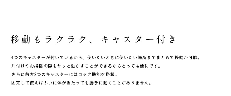 | スタッキングできる シンプルな万能ワゴン Stacking Wagon 4段 AKB-439 デスクサイドやランドリー、キッチンなど置き場を選ばず様々なシーンで使える4段ワゴン。粉体塗装のフレームはサビに強く、水回りでも安心してお使いいただけます。キャスターがついているので移動もラクラク。使わないときにはスタッキングしてコンパクトに収納することができます。 ■置き場を選ばないシンプルデザイン 置き場を選ばず使えるシンプルなデザインのスタッキングワゴン。本体はサビにも強い粉体塗装を施したスチール製。デスクサイドやリビングはもちろん、キッチンやランドリーなど水回りでも安心してお使いいただけます。中が見えるストライプ状のフレームだから、お部屋に置いても圧迫感を感じず、軽やかな雰囲気になっています。 ■移動もラクラク キャスター付き 4つのキャスターが付いているから、使いたいときに使いたい場所までまとめて移動が可能。片付けやお掃除の際もサッと動かすことができるからとっても便利です。さらに前方2つのキャスターにはロック機能を搭載。固定して使えばふいに体が当たっても勝手に動くことがありません。 ■コンパクトに収納可能 使わないときにはスタッキングしてコンパクトに収納することができます。ツメを下段にはめ込むだけで組み立てができるから、アウトドアなどで持ち運ぶ際にもぴったり。 ※こちらの商品はお客様組立となります。 ※一部画像には同シリーズ別商品の画像を使用しております。 | |