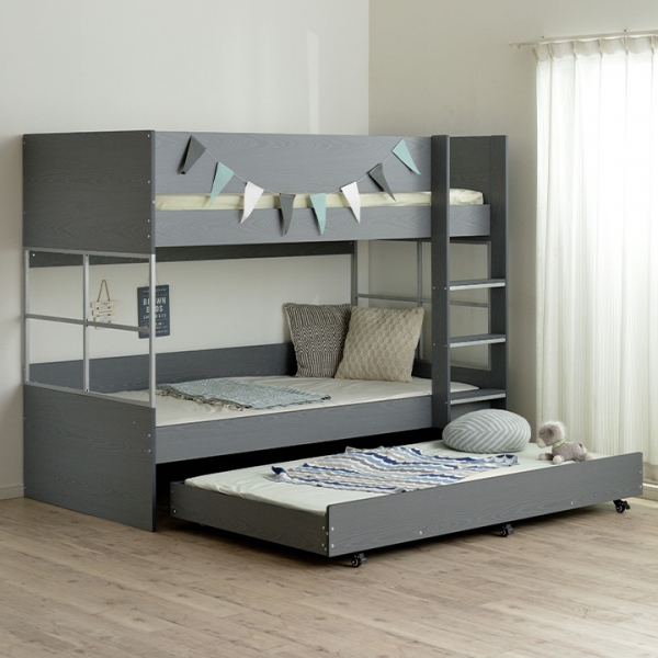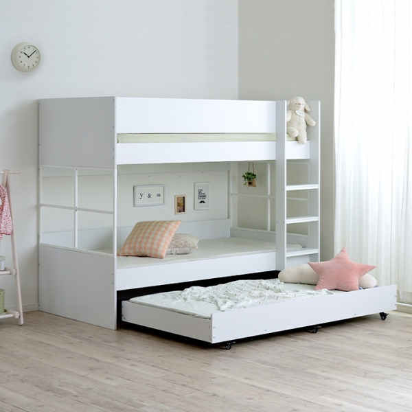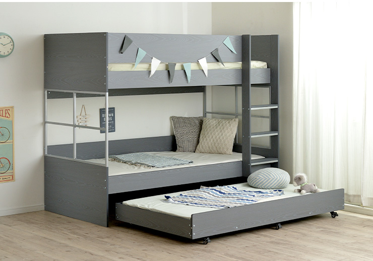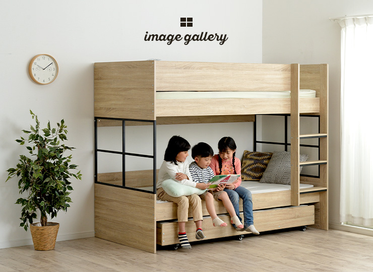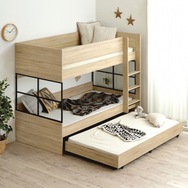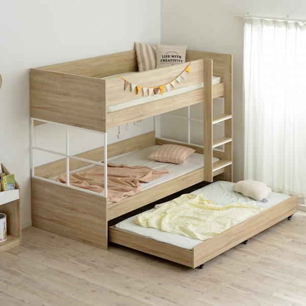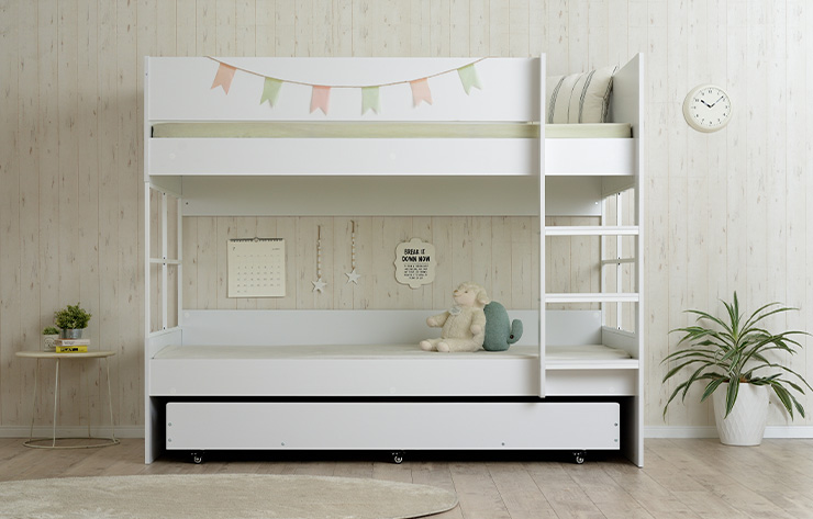 | 秘密基地みたいな三段ベッド Triple bunk bed Peep(ピープ) ■開放感のある3段ベッドで空間を楽しもう 側面の窓のようなデザインがかわいい三段ベッドPeep(ピープ)。キャスター付きの子ベッドは中段の下に収めることができ、お部屋を広々とお使いいただけます。高めのサイドフレームや角丸仕様など安全性にもこだわりました。お部屋の雰囲気に合わせて5色からお好きな色をお選びいただけます。 ■シンプルで飽きのこない5color 清潔感あふれるオールホワイト、スチールの色が選べるヴィンテージオーク、落ち着いたウォールナットに、シックでお洒落なブルーグレーの計5カラーをご用意しました。どの色もお部屋の家具とも馴染みやすく、大人の方も使えるカラーです。 ■必要なときだけ取り出せる子ベッド 下段の子ベッドには6つのキャスターが付いており、使うときだけサッと引き出して使うことができます。使わないときには中段の下にスッキリ収納できるから、限られたお部屋のスペースを有効活用できますね。前方の3つのキャスターにはロック機能を搭載。ロックをしておけば、お休みの時でも安心してお使いいただけます。来客時のエキストラベッドとしてもおすすめです。 ■省スペースな垂直はしご 場所をとらない垂直はしごで本体にしっかりと固定しているのでぐらつかず、安全性もアップ。さらに安心してお使いいただけるようにステップの下にはスチールの補強フレームを付けました。 ■安心してお使いいただける安全設計 高めのサイドフレームや角の丸み加工など、安全面にもこだわった設計です。 ※こちらの商品はお客様組み立てとなります。 ※はしごの位置を変えるこはできません。 | |