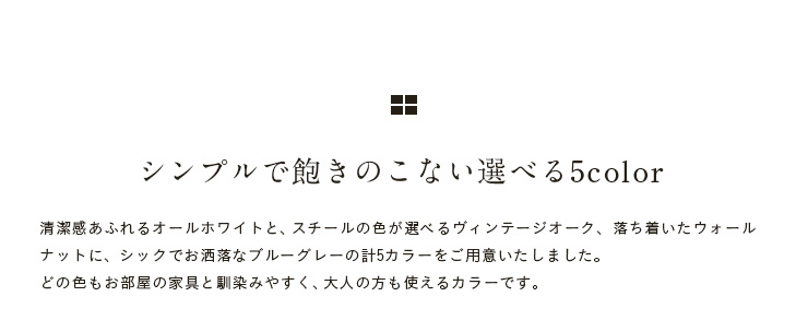 | カラー | オールホワイト ヴィンテージオーク/ブラック ヴィンテージオーク/ホワイト ウォールナット/ブラック ブルーグレー/シルバー |