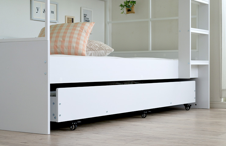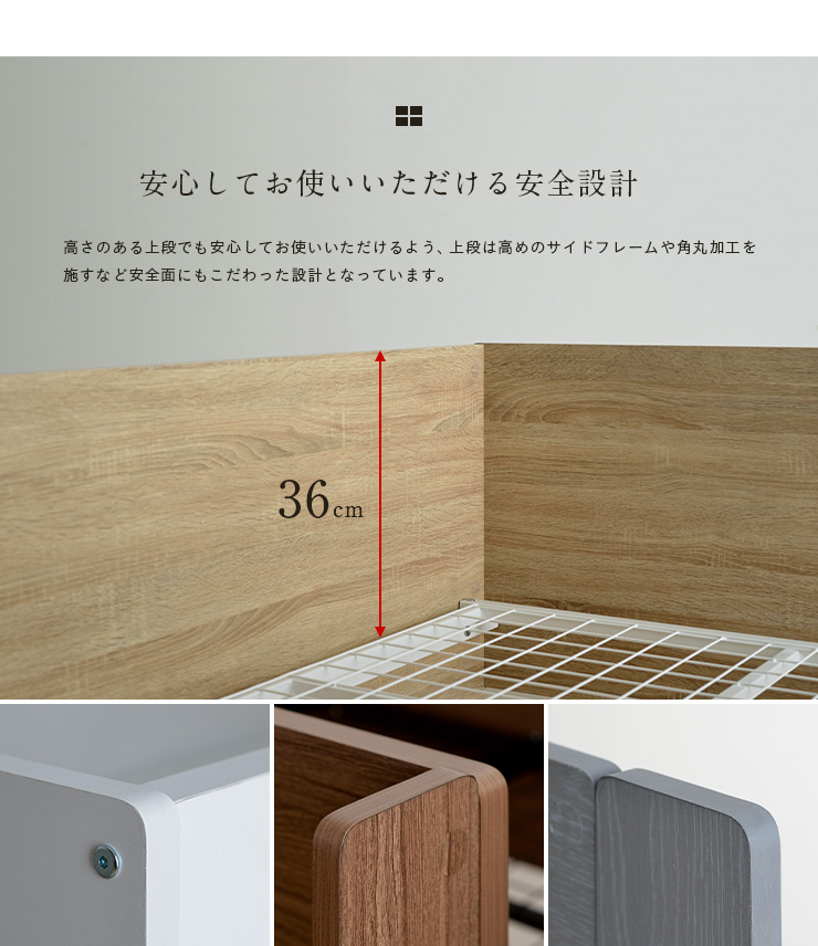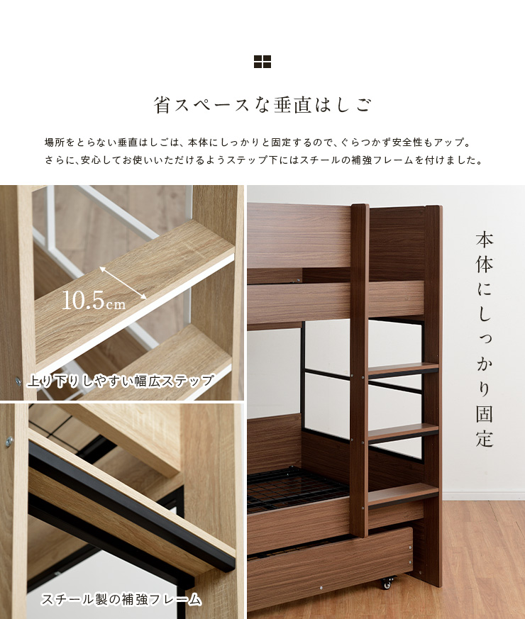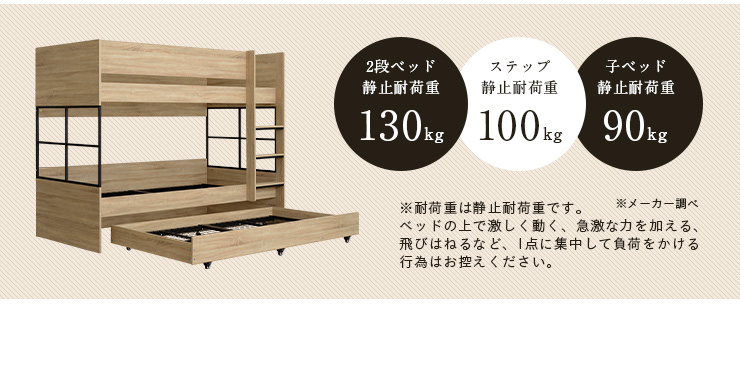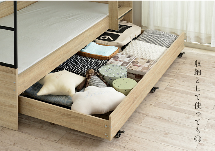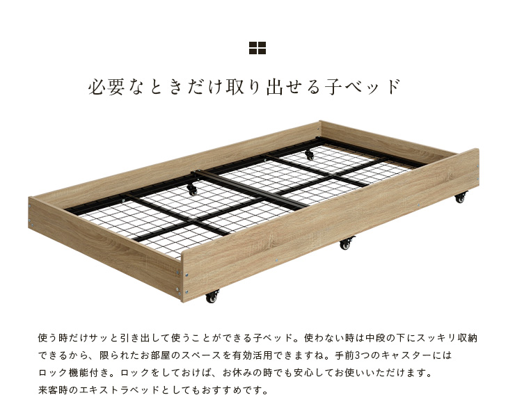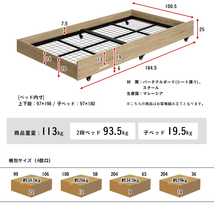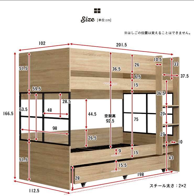 | サイズ | 全体:W201.5 × D102 × H166.5cm 子ベッド:W184.5 × D100.5 × H25cm 上下段ベッド内寸:198 × 97cm(Sサイズ) 子ベッド内寸:180 × 97cm (SSサイズ) |