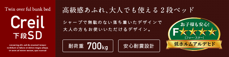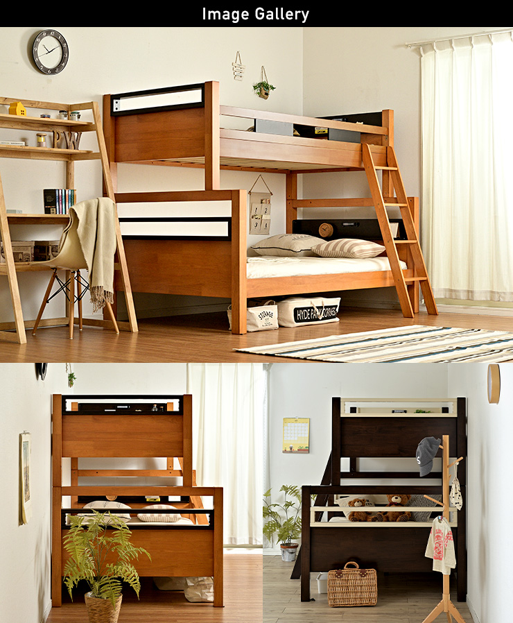 | Twin over full bunk bed Creil (クレイユ) 下段SD 「誰でも使える」「ずっと使える」をコンセプトに作られた2段ベッド。シャープで無駄のない落ち着いたデザインで子供はもちろん、大人まで使えるデザインに仕上げました。お子様が大きくなっても買い替えることなくそのままお使い頂けます。 ■サイズ違いの下段セミダブルタイプ 上段はシングル、下段はセミダブルとサイズの異なる2段ベッド。下段では兄弟で一緒に寝たり、まだ寝かしつけが必要な小さなお子様と添い寝することもできます。 ■床板は通気性に優れたスノコ仕様 風の通り道を確保し、湿気を逃がすことでカビやダニの繁殖を妨げます。上段は四方にスノコ受けを設けた事により、しっかりとスノコを支えくれて安心。 ■地震対策耐震機能強化 ダボをビスでガッチリ固定し、縦揺れ対策もバッチリ。さらにサイドフレームの中央にハシゴを固定することにより、ぐらつきを防止しました。 ■安心設計の耐荷重700kg 第三者検査機関による耐荷重試験において、静止物耐荷重700kgをクリア。お子さんが小さくて一人で寝れなくても、これならお母さんと一緒にぐっすり。 ■フックタイプの斜めはしごで上り下り簡単 斜めはしごで上り下りしやすく着脱も簡単に行えるためお掃除もラクラク。すべりり止め加工済みで小さなお子様でも安心してお使いいただけます。 ■ベッドには欠かせない宮付き 携帯やゲーム機などを充電するのに便利なコンセントは2口仕様。ライトはLEDを採用し、目に優しく経済的。 ■上下段は別々に使用可能 大きくなったら上下を分離してシングルベッドとしても使えます。サイドフレームを外しても使えるので、見た目は普通のベッドと変わりありません。 ■ホルムアルデヒド対策 安心のF☆☆☆☆ 本体、スノコ共に第三者検査機関によるホルムアルデヒド等級の最上位規格「F☆☆☆☆」をクリア。 ※こちらの商品はお客様組立となります。 | |