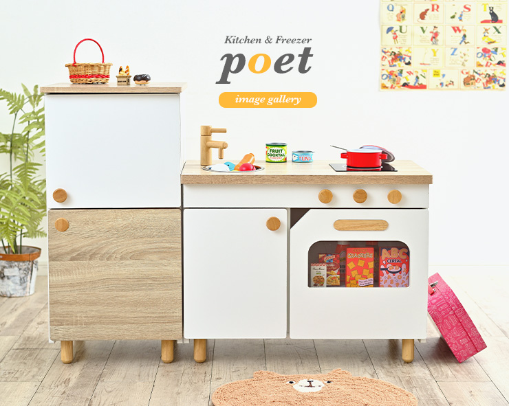 | お絵描きもできるままごとキッチン冷蔵庫 Freezer poet ポエト 冷蔵庫 おしゃれでモダンなままごとキッチンpoetシリーズの冷蔵庫いろんな食材を入れてママのまねっこ。ナチュラルなカラーにまとめたpoetは、インテリアとの相性も良く、女の子はもちろん男の子にもおすすめの商品です。 ■本物そっくりな冷蔵庫で楽しくおままごと 食べ物がたくさん入るたっぷりの収納棚板は高さ調整ができる可動式。エッグホルダーや調味料入れにピッタリなドアポケット。おままごとセットやおもちゃなどをたっぷりしまえる。遊び終わったらお片付けの習慣を身に付きます。 ■背面は自由にお絵かきできるホワイトボード 背面にはお絵かきができるホワイトボード付き市販のマーカーを使って自由にお絵かきを楽しめます。黒板タイプと違って、粉が出ることがないのがいいですね。ウェットティッシュを使うと描いた絵を消すことができます。何度もお絵かきができるからこどもの想像力も膨らみますね。 ■飽きのこないシンプルデザイン 取手と脚にはラバーウッドの無垢材を使用。木のぬくもりを感じるシンプルで飽きの来ないデザインです。足を外しても遊んでもOK。お子様の身長に合わせて最適な高さでおままごとを楽しめます。 ■安全面にもこだわり ・角はまるく加工 ・手を挟みにくい扉 ・ねじ穴隠しのシール付き ※こちらの商品はお客様組み立てとなります。 ※キッチンや調理器具、おもちゃやペン等は付属しておりません。必ず内容をお確かめの上ご購入ください。 ※ウェットティッシュを使用の際は最後に乾いた布やティッシュで必ず水分をふき取ってください。 ※時間が経過すると絵や文字が消しにくくなる場合がございます。 ※ホワイトボード用の水性ペンをご使用ください。 | |