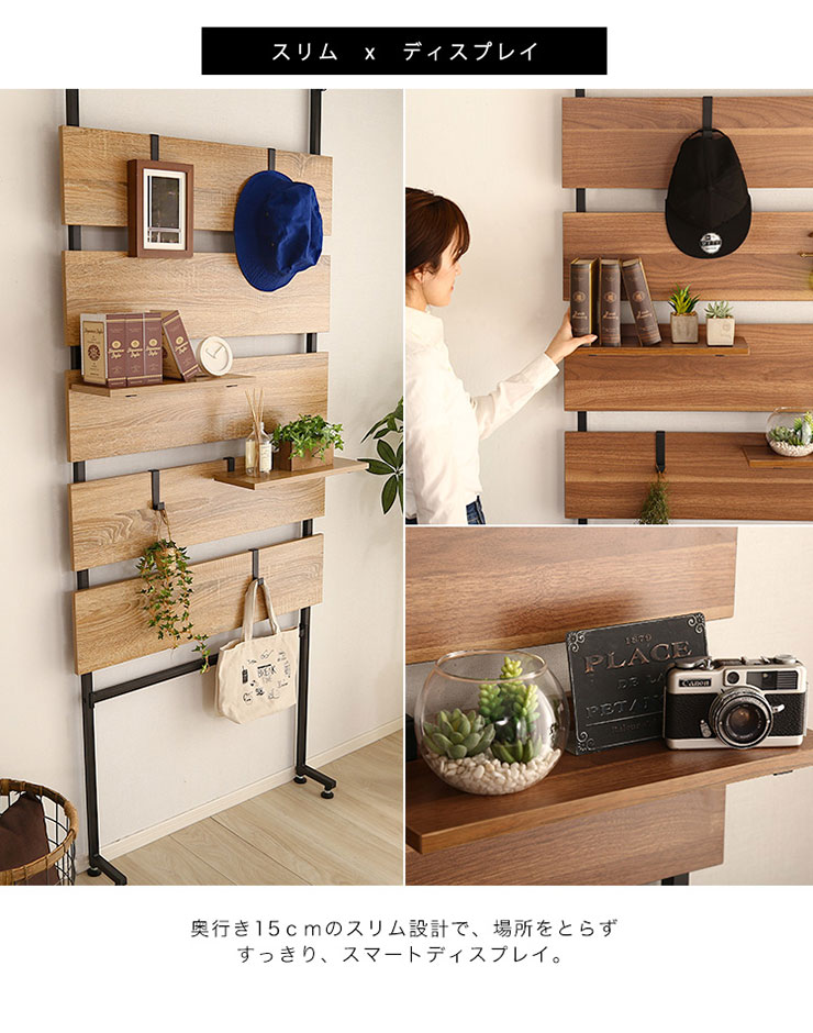 | 突っ張り木板ラダーラック Escala(エスカーラ) 幅80cm 木目の棚板とブラックスチールが美しいヴィンテージテイストのラダーラック80cm幅。お部屋の目隠しや付属の棚を使い小物を置いたりと様々な使用用途で便利です。つっぱり式なので、地震などの揺れの際に倒れにくい安心設計。壁に穴を開けることがないので賃貸でも安心です。 ■魅せる壁ぎわディスプレイ 壁ぎわの省スペースを利用したラダーラックなら、好きなものを置いたり、掛けたり、自由に収納。 ■穴あけ不要 天井からのつっぱり式だから、壁に穴を開ることなく、手軽にお部屋の雰囲気を変えられます。賃貸でも安心。 ■棚板 x 置く収納 取り外しができる棚板は2枚。どこでも掛けるだけ。好きなものを飾って、、。 ■フック x 掛ける収納 アイアンフックは4個付き。あれこれまとめて引っかけておけるので、とても便利。バッグや帽子の普段使いを手にとりやすく。 ■スリム x ディスプレイ 奥行き15cmのスリム設計で、場所をとらずすっきり、スマートディスプレイ。 ■工具不要の取り付け 女性でもカンタン! 3ステップ step1 天井まで伸ばす step2 調整ノブをしめる step3 レバーでつっぱる ■お部屋に合わせたユーススタイル ・for kitchen 意外とかわいいキッチンツールは飾る方が楽しいかも! ・for living ワンルームでもおさまりがいいサイズ。 ・for partition 簡単に雰囲気を変えられます。 ■Details ・キズ防止クッション付き ・高さ調整つまみ 天井高200~260cmに対応 ・防滴・防汚でお手入れ簡単 ・フックは4コ付き ・脚はザラつきのある ヴィンテージテイスト ・レイアウト自由な棚板2枚は 裏面をアイアンスチールで補強 ・転倒を防ぐ2本脚 ・ぐらつき防止の アジャスター付き ・設置面はキズ防止ゴム付き ※お客様組み立てとなります。 | |