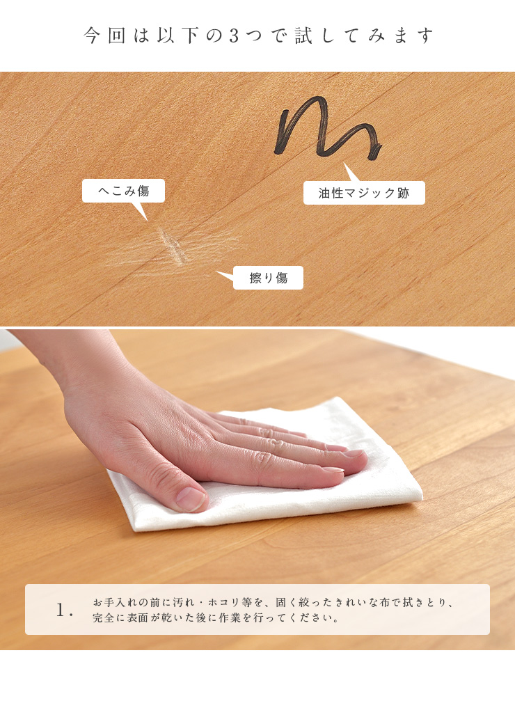 | 杉工場メンテナンスオイル 自宅でできる、簡単メンテナンス 自然系のオイルで補修も自宅で簡単行えます。お手入れを重ねる度に、木の風合いが増していく無垢材の家具。ご自宅でメンテナンスすることによって、愛着がより深まり、お子さまに「もの」を大切にする心を育むことができます。 【メンテナンス方法】 ご用意いただく物 ・メンテナンスオイル ・サンドペーパー(#320~400)※メンテナンスオイルに付属/#320 ・ウエスなど柔らかい綿の布※メンテナンスキットに付属 ※自然系のオイルですが、作業時はビニール手袋を着用して行うことをお勧めします。 1.お手入れの前に汚れ・ホコリ等を、固く絞ったきれいな布で拭きとり、完全に表面が乾いた後に作業を行ってください。 2.擦り傷・へこみ傷のある面はサンドペーパー(#320~400)で木目に沿ってなじませるように磨いてください。 ※サンドペーパーは付属しておりますが、足りない際は市販のものをお使いください。 3.メンテナンスオイルを蓋をしたままよく振り、混ざり合った状態で、ウエス(柔らかい綿の布など)に含ませます。作業時は必ず窓を開けて風通しを良くして行ってください。 4.木目に沿って均一に伸ばしながら塗り込んでください。作業時は必ず窓を開けて、風通しを良くしてください。オイルがなじんだら、別のウエスを使い、ウエスにオイルがほとんどつかなくなるまでよく拭き上げます。 5.拭き上げ後、直射日光のあたらない場所で12時間程度乾燥させてください。乾燥が不十分な状態で上に物を置いたりすると、跡がついたり、色移りの原因となります。 6.メンテナンスオイルのご使用後は必ず蓋をしっかりと閉め、お子さまの手の届かない、直射日光の当らない冷暗所で保管してください。オイルを含んだ「ウエス・布」等は自然発火する可能性があります。ご使用後の「ウエス・布」は速やかにナイロン袋に入れて、十分に水を浸し、袋口を輪ゴム等でしっかり密封して、生ゴミと一緒に処分してください。 ■対応商品について こちらのメンテナンスオイルは「杉工場の製品」で「無垢材」「オイル仕上げ」のものに限りご使用いただけます。 ご注意ください ※お子さまの手の届かない場所・冷暗所にて保管してください。 ※誤って飲み込んだ場合、直ちに医師の診療を受けてください。 | |