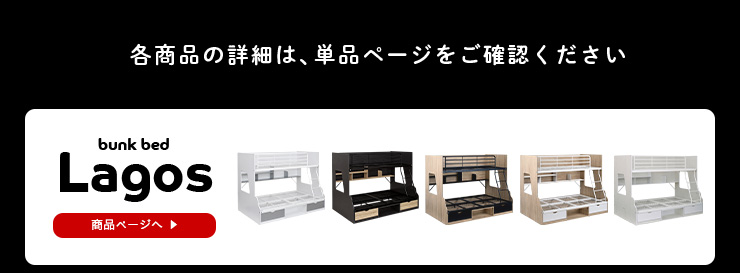 | シングル×セミダブルの2段ベッド 下段SDベッド Lagos(ラゴス) ベッドにぴったりサイズのマットレスSET ◯下段SDベッド Lagos(ラゴス) こだわり設計で使いやすいサイズ違いの2段ベッド上段はシングル、下段はセミダブルとサイズが異なるベッドで構成された2段ベッドLagos。下段のセミダブルでは、小さなお子さまと添い寝することも可能です。遊び心のあるデザインと収納力も兼ね備え、使い勝手も抜群。お部屋のスペースを無駄にしないハシゴや通気性の良いメッシュ床板など、こだわりの詰まったベッドです。 ■親子で使える2段ベッド ■空間を無駄にしない収納スペース ■長く使えるバイカラー ■省スペースな一体型ハシゴ ■通気性に優れたメッシュ床 ■安全性にもこだわりを ■お子さまから大人まで安心して使える静止耐荷重130kg ※こちらの商品はお客様組み立てとなります。 ※組み立て方や若干の個体差によって、表記サイズと完成形のサイズに多少の誤差が生じる場合がございます。予めご了承ください。 ◯pocket coil mattress pearl(パール) 使いやすさと寝心地にこだわった、ポケットコイルマットレス 普通のベッドはもちろん、2段ベッドやシステムベッドなど、お子さま用のベッドにも使える厚さ12cmの薄型タイプ。身体にフィットするポケットコイル仕様で寝心地にもこだわりました。マンションなどの集合住宅でも搬入しやすい圧縮梱包でお届けします。 ■柔らかく身体を包み込む、ポケットコイル仕様 ■使いやすい、厚さ12cmの薄型タイプ ■伸縮性にすぐれたニット生地 ■コンパクトだから設置しやすい圧縮梱包 ※圧縮袋は一度開封すると再圧縮できません。 ※開封する際はハサミを使用し、ケガ等に十分気をつけながら行ってください。 ※開封後約1日で本来の大きさに復元します。サイズには多少の誤差が生じる場合がございます。 ※マットレスを干す際、日光にさらし続けると変色を起こす恐れがありますので、ご注意ください。 ※布団乾燥機のご使用はお避け下さい。 ※普段のお手入れは、柔らかい布地で乾拭きしてください。 ※ご使用の際にはカバーや敷きパッド等を合わせてお使い下さい。 ※商品ページの画像内には一部サイズ違いのものを使用しております。 ※床板の使用を随時変更しております。画像は変更前のものを使用しておりますので、予めご了承ください。【変更前】メッシュボード→【変更後】LVLボード | |