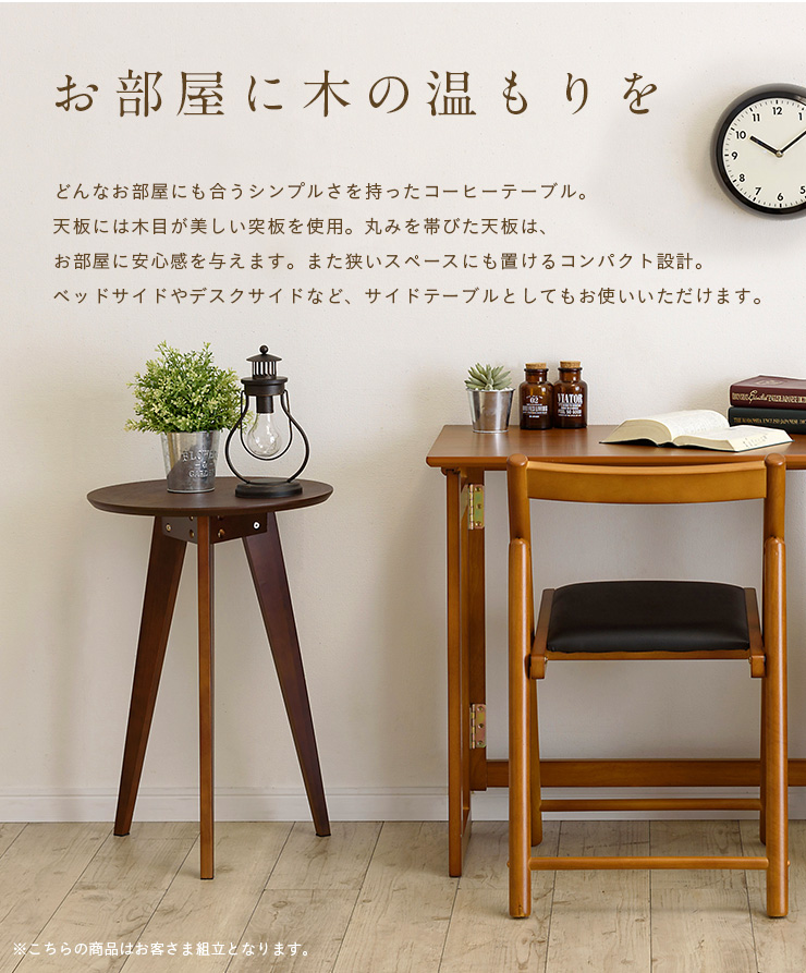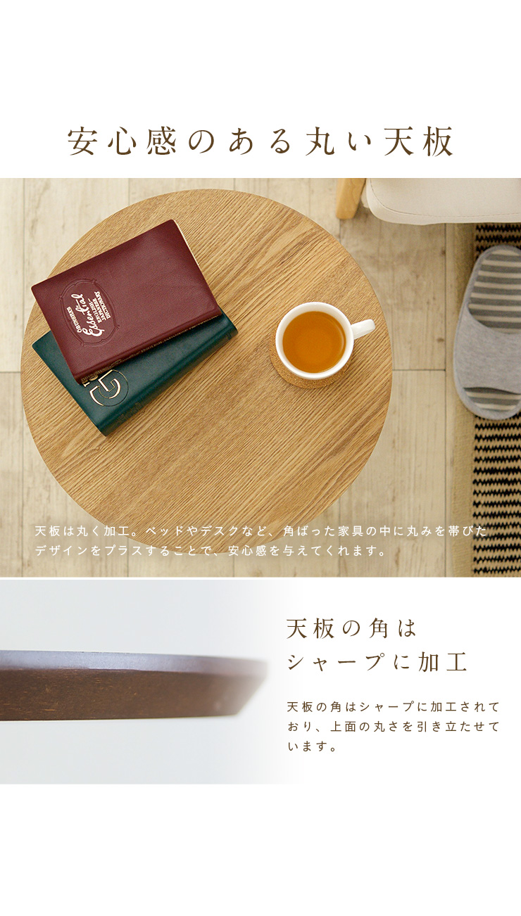 | お部屋に素朴な木の温かみを Coffee Table(コーヒーテーブル) どんなお部屋にも合うシンプルさを持ったコーヒーテーブル。 天板には木目調の突板を使用。丸みを帯びた天板は、お部屋に安心感を与えます。また狭いスペースにも置けるコンパクト設計。ベッドサイドやデスクサイドなど、サイドテーブルとしてもお使いいただけます。 ■安心感のある丸天板 天板は丸く加工。ベッドやデスクなど、角ばった家具の中に丸みを帯びたデザインをプラスすることで、安心感を与えてくれます。天板の角はシャープに加工されており、上面の丸さを引き立たせています。 ■全面に感じることができる木の温かみ 天板には木目調の突板を使用しており、木の風合いをしっかりと感じることができます。脚部にはパイン材の天然木を使用。素朴な木の温かみを感じることができます。 ■コンパクトな設計 天板は直径40cmと、コーヒーテーブルの中ではコンパクトな設計です。ソファサイドはもちろん、テレビボードやベッドのサイドテーブルとしてもお使いいただけます。本やスマホ、リモコンなどの小物置いて生活が便利に。 ■detail 備え付けの六角棒レンチを使用するだけなので、工具不要で組み立てられます。脚裏には床の傷付きを防止するフェルトを使用。 ※こちらの商品はお客様組み立てとなります。 | |