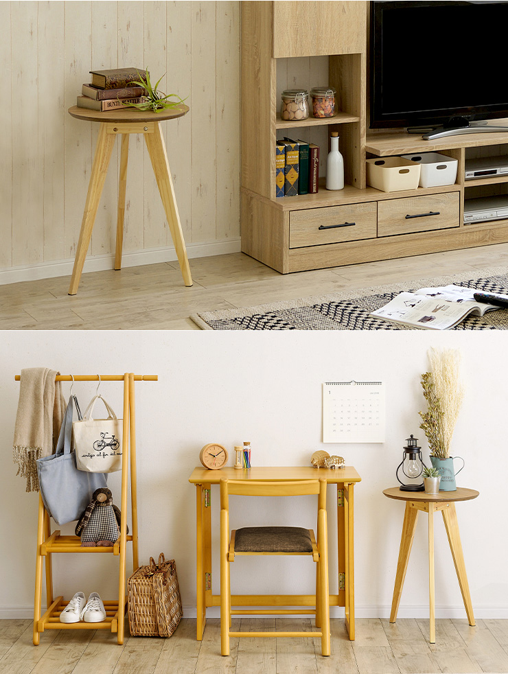 | 材質 | 天板:突板(BR/ウォルナット、NA/タモ)・MDF 脚部:天然木(パイン材) |