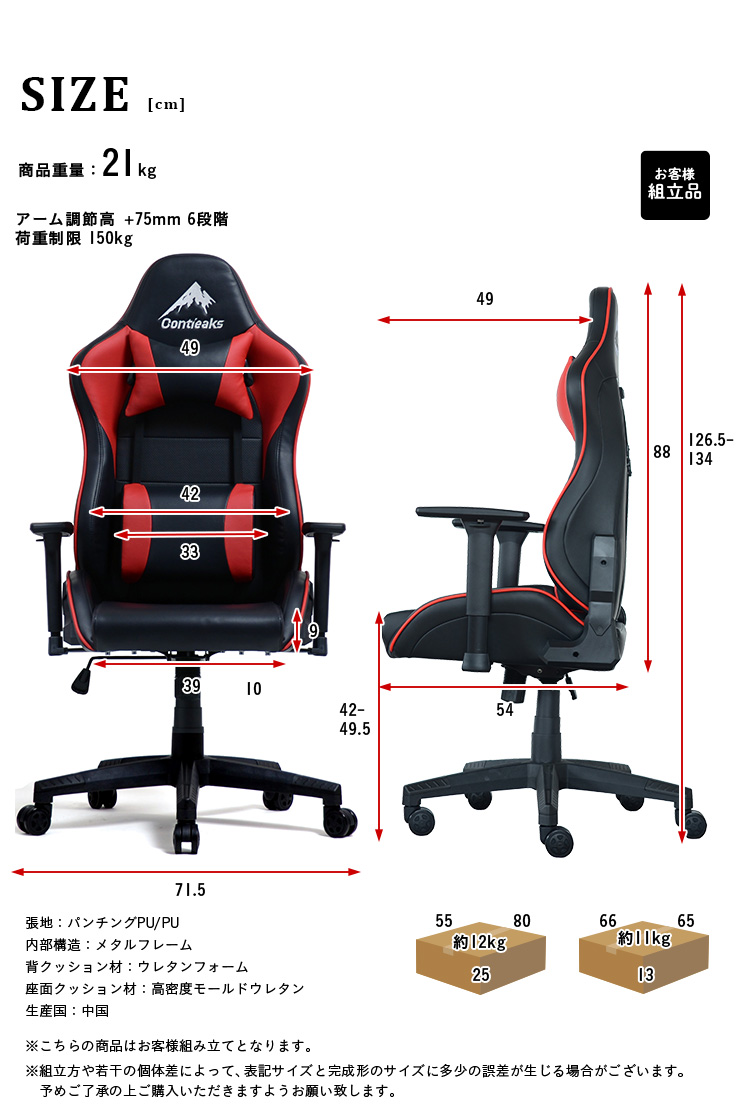 | Contieaks Eiger -アイガー- 日本のインテリアメーカーが日本人の体格や使用環境を分析して開発したContieaksゲーミングチェア。 Eigerは背もたれと座面の張地にパンチング加工を施すことで高い通気性を実現しました。 豊富な機能性で様々なプレイ環境にも対応。 長時間の使用でも蒸れにくい快適な座り心地でプレイをお楽しみ頂けます。 ■Function・・・様々なプレイ環境に対応した豊富な調整機能 ・プレイ環境に応じて調整できる4Dアームレスト ・プレイの合間に一息つけるリクライニング機能 ・小柄な方にも対応した低座面高シリンダー ・ロッキング機能 ■materia・・・素材へのこだわり ・張地は高い耐久性と高級感のあるPUレザー ・座面と背もたれはパンチング加工で高い通気性 ・クッション材は快適な姿勢をキープできる高反発のモールドウレタン ・内部フレームは剛性が高いメタルフレーム ・キャスターは床の傷つきを軽減するPUキャスター ■Sagety・・・安心、安全設計 ・JIS規格に基づく品質試験やメーカー独自試験をクリア ・最大150kgまで可能な高品質シリンダーを使用 ※お客様組立となります ※サイズには誤差が生じる場合がございます。 | |