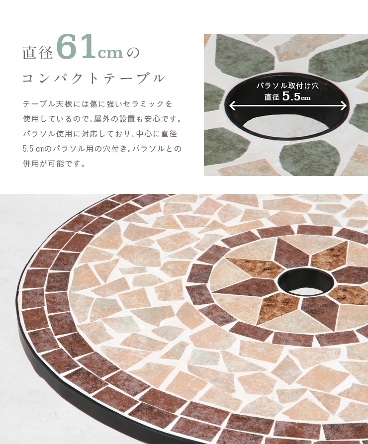 | おしゃれなモザイク調デザインのテーブル&チェア モザイクテーブル&チェア3点セット ガーデンファニチャー3点セット 天板には傷に強いセラミックを使用しており、ベランダやバルコニー、テラスなどで大活躍。パラソル使用もできる穴付きのため使い勝手がよく、省スペースでも置きやすいコンパクトサイズのテーブル&チェア3点セットです。 直径61㎝のコンパクトテーブル 傷に強いセラミックを使用しているので、屋外に設置しても安心です。中心には直径5.5㎝の穴があるため、パラソルとの併用が可能。花柄と星柄の2種類からお選びいただけます。 便利な折りたたみ式チェア 背もたれはテーブルに合わせたモザイク調デザイン。折りたたみ可能なため、使用しないときはコンパクトに収納できます。 圧迫感のないシンプルなデザイン どんな場所にも合わせやすく、飽きのこないデザイン。スッキリとしたシルエットが特徴で、開放感のある空間を演出します。インテリアとしても◎ ※ご注意ください ・安全にご使用いただくために、約1ヵ月毎にナットの締め直しを行ってください。 ・商品は水平な場所に置いてください。 ・傷つきやすい床でのご使用は避けてください。 ・怪我につながる恐れがありますので、過度に偏って体重をかけたり、テーブルの上に立たないでください。 ・シンナーやベンジン、磨き粉などは変色や傷の原因になるため使用しないでください。 ・直射日光の当たる場所は日焼けによる変色や、反りの原因になります。 ※こちらの商品はお客様組み立てとなります。 ※画面上のカラーはブラウザや設定により、実物とは若干異なる場合がございます。あらかじめご了承の上ご注文ください。 | |