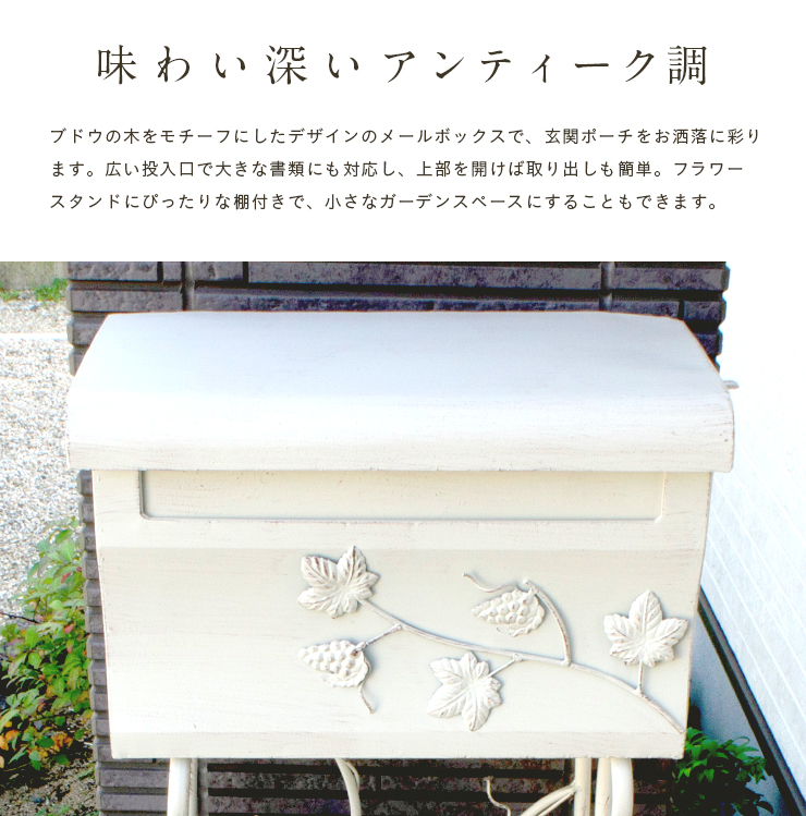 | メールボックス Grape(グレープ) 2色対応 味わい深いアンティーク風メールボックス。 ブドウの木をモチーフにしたデザインで、玄関ポーチをおしゃれに彩ります。広い投稿口で大きな書類にも対応し、上部を開けば取り出しも簡単。フラワースタンドにぴったりな棚付きで、小さなガーデンスペースにすることもできるメールボックスです。 ※サイズに多少の誤差が生じる場合がございます。 ※アンティーク調の風合いをお楽しみいただくため、擦れ跡のような加工や傷を施しています。 ※完全防水、完全密閉型ではありません。雨が当たらない軒下設置を推奨しております。 | |