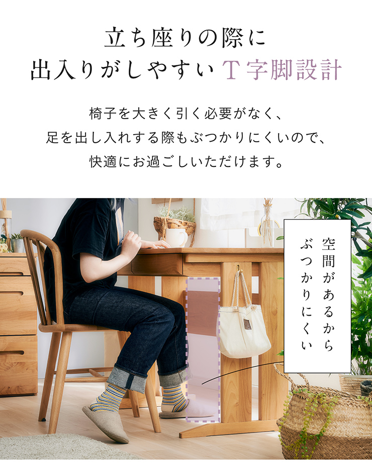| 直線的でシンプルな国産デスク Sign(サイン) 直線を基調としたシンプルなデザインながら、ぬくもりを感じるナチュラルテイストのデスク T字脚設計で出入りがしやすい、幅100cmのシンプルデスク「Sign」。リビングに置いても馴染みやすい、直線的なスッキリデザインが人気です。国産ならではの丁寧な仕上がりで、お子さまの学習机としてだけでなく大人の方のワークデスクとしても、幅広くお使いいただけます。 ■自然の温もり溢れる優しい素材 ・アルダー材 木質は比較的柔らかく、肌触りがよくて軽いのが特徴。優しい色合いと美しい木目が人気の木材です。 ・無垢材 合板とは違い、原木を製材・加工したものを無垢材といいます。木そのものの質感・風合いが感じられる自然素材です。 ■自然オイル塗装&低ホルムアルデヒド F☆☆☆☆ 天然由来の植物油を主材料とした自然塗装を主に使用 。デスク天板は、メーカー独自開発の「UFO(UV “紫外線” フィニッシュ オイル)塗料」により、自然塗装の風合いと UV 塗装の強度を両立しています。 人体に有害な物質は一切含まれていません。 ■3つの嬉しい機能 ・出入りしやすいT字脚設計 ・2杯のフルスライドレール引き出し ・左右にフック付き ※こちらの商品はお客様組み立てとなります。 ※組み立て方や若干の個体差によって、表記サイズと完成形のサイズに多少の誤差が生じる場合がございます。 ※こちらの商品は、天然木を使用しております。その為、木の表情や風合いには個体差がございます。節など木の風合いを理由とした返品・交換は対象外となります。 ※使用している中で汚れや目立つキズが出来た時は、付属のメンテンスキットをご使用下さい。 ※踏み台などにして、デスクの用途以外で使用しないで下さい。破損や怪我の原因となります。 ※こちらは、デスク単品の商品ページとなります。チェア・ラック・デスクライト等は別売りとなります。 ※オイル塗装の特徴として、使用初期段階で衣服等に色移りする可能性がございます。ご使用前に表面を布等で軽く拭いてからご使用下さい。 ※お手入れは乾いた布で軽く拭いてお手入れをして下さい。(あまり強く拭きますと、キズの原因となりますのでご注意下さい) ※天然木を使用しておりますので、水拭き等はおやめ下さい。 ※シミの原因となる汚れ(お茶・コーヒー・しょうゆ等)が付いた場合は、放置せずすぐに拭き取って下さい。また、濡れたものを長時間放置しますと、同様にシミや変色の原因となります。 ※熱したものや汚れたものを直接置きますと、シミや変色の原因となりますのでご注意下さい。 | |