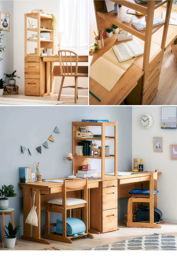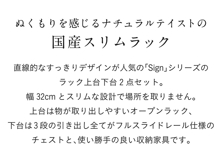 | 場所を取らないスリムラック Sign(サイン) 直線を基調としたシンプルなデザインながら、ぬくもりを感じるナチュラルテイストのラック 直線的なスッキリデザインが人気のシリーズ「Sign」のラック上下2点セット。幅32cmとスリムな設計で場所を取りません。上は物が取り出しやすいオープンラック、下は全てフルスライドレールのチェストと、使い勝手の良い収納家具です。 ■子ども部屋に置くツインデスクの間仕切りとして デスクを横に並べても、タワータイプのラック上台が仕切りとして活躍してくれるので、より集中してお勉強することができます。 ■自然の温もり溢れる優しい素材 ・アルダー材 木質は比較的柔らかく、肌触りがよくて軽いのが特徴。優しい色合いと美しい木目が人気の木材です。 ・無垢材 合板とは違い、原木を製材・加工したものを無垢材といいます。木そのものの質感・風合いが感じられる自然素材です。 ■自然塗装&低ホルムアルデヒド F☆☆☆☆ 天然由来の植物油を主材料とした自然塗装を使用 。人体に有害な物質は一切含まれていません。 ■3つの嬉しい機能 ・カギ付き ・3段全てフルスライドレール仕様 ・可動棚2枚付き ※こちらの商品はラック上台と下台の連結が必要な、簡単組み立てとなります。 ※若干の個体差によって、表記サイズと完成形のサイズに多少の誤差が生じる場合がございます。 ※こちらの商品は、天然木を使用しております。その為、木の表情や風合いには個体差がございます。節など木の風合いを理由とした返品・交換は対象外となります。 ※こちらのページは、ラック上台・ラック下台の計2点セットとなります。デスク・チェア等は別売りとなります。 ※オイル塗装の特徴として、使用初期段階で衣服等に色移りする可能性がございます。ご使用前に表面を布等で軽く拭いてからご使用下さい。 ※お手入れは乾いた布で軽く拭いてお手入れをして下さい。(あまり強く拭きますと、キズの原因となりますのでご注意下さい) ※天然木を使用しておりますので、水拭き等はおやめ下さい。 ※シミの原因となる汚れ(お茶・コーヒー・しょうゆ等)が付いた場合は、放置せずすぐに拭き取って下さい。また、濡れたものを長時間放置しますと、同様にシミや変色の原因となります。 ※熱したものや汚れたものを直接置きますと、シミや変色の原因となりますのでご注意下さい。 | |