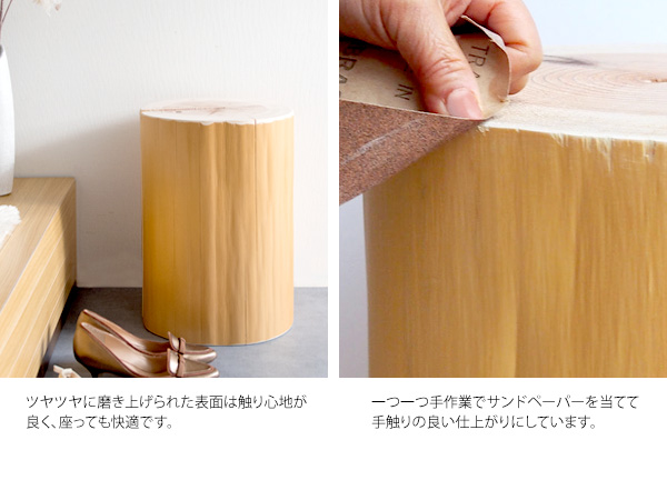 | 丸太スツール Cierva(シエルバ) CH-3042 吉野の豊かな森から間伐された杉を、奈良の冬の伝統工芸磨き丸太に仕上げた多目的丸太スツール『Cierva(シエルバ)』。座りやすい高さでダイニングや玄関、カウンターでのスツールとしてお使いいただけます。ソファやベッドサイドに置いてサイドテーブル使いもオススメです。美しい年輪と色合いは置くだけで高級感のある雰囲気を演出。吉野杉ならではの香りや、ツヤツヤに磨かれた手触りはお部屋に彩りと安らぎを与えてくれます。 | |