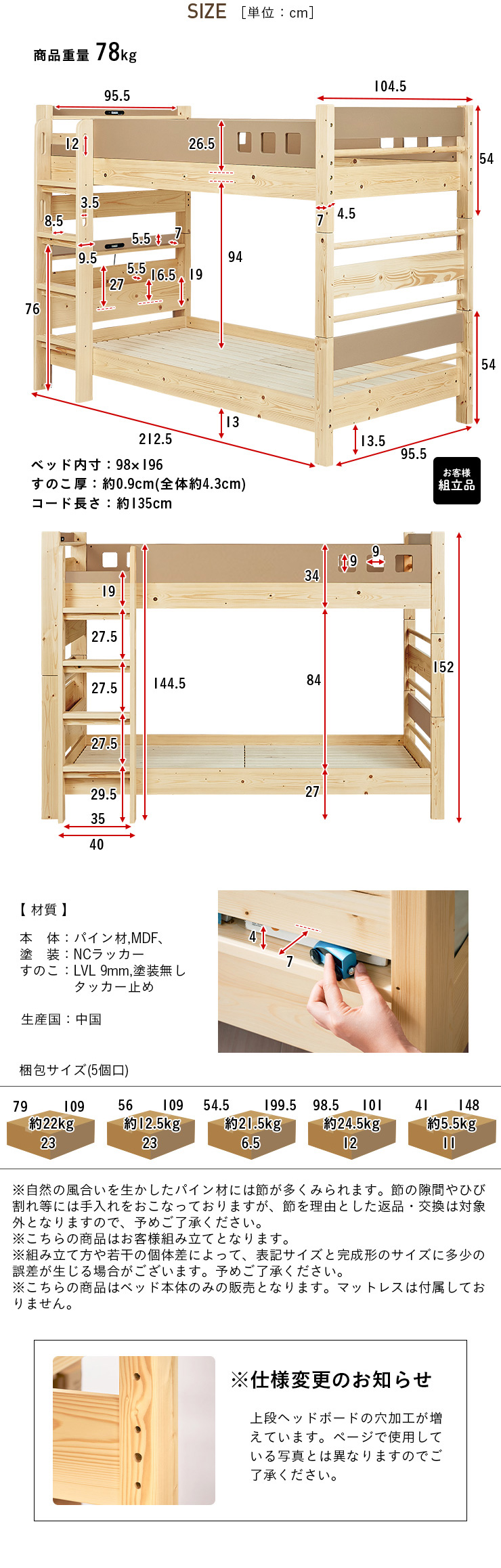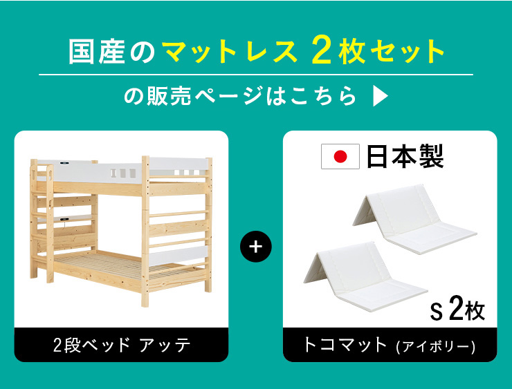| bunk bed atte(アッテ) 天然木の中でぐっすり、優しいカラーの2段ベッド シンプルなデザインに「LEDライト」や「コンセント」、「本立て」など、うれしい機能が盛りだくさん。シングルベッドとしても使える分割式で大きくなっても使えます。くすみカラーがポイントの3色からお選びいただけます。 ■natural wood 木のぬくもりを感じる居心地の良いベッド 木のぬくもりを感じられるよう、材質にパインの無垢材や突板を使用し、居心地の良い空間に。優しいナチュラルカラーに入った明るすぎないくすみカラーが、落ち着きのあるおしゃれなお部屋を演出してくれます。 ■広い下段スペース 下段高を低く設計しているので、小さなお子さまでも出入りが簡単。空間高が広いので成長してからも頭をぶつけにくく、ゆったりとした広い空間を確保することができます。 ■便利な宮棚 宮棚には、コンセント・LEDライトが上段と下段のどちらにも付いており、それぞれが好きなものを置くことができます。 コンセント:500Wまでご使用可能 LEDライト:電球は長寿命で明るいLEDを採用。 ■宮棚の下も有効活用 本の表紙を見せて収納できる本立てをつけました。タブレットの収納可能です。 ■分割仕様で長く使える 上段、下段を分割できるので、2つのシングルベッドとしても使えます。ライフスタイルやお子さまの成長に合わせて長く使うことができる2段ベッドです。 ■省スペースで使いやすく、耐震効果も上げる「固定式垂直はしご」 場所を取らないのでお部屋を広くお使いいただけます。固定式のはしごは、ぐらつきや転倒を防ぐとともに、上段と下段の固定力を高める効果も。 ■お部屋に合わせてヘッド・フットの位置を変えることができます。 ※はしごの位置は固定となります。 ※象段・下段のヘッドボードは同じ側のみ設置可能です。 ■遊び心のあるサイドフレーム 四角い窓がアクセントのサイドフレームは、他にはないオリジナルデザイン。 ■通気性のいいLVLすのこ 風の通り道を確保することでカビやダニの繁殖を防ぎます。 ■安心の角丸仕様 普段ご使用いただく際の危険を少しでも取り除くために、角はすべて面取り加工を施しています。 ※自然の風合いを生かしたパイン材には節が多くみられます。節の隙間やひび割れ等には手入れをおこなっておりますが、節を理由とした返品・交換は対象外となりますので、予めご了承ください。 ※こちらの商品はお客様組み立てとなります。 ※組み立て方や若干の個体差によって、表記サイズと完成形のサイズに多少の誤差が生じる場合がございます。予めご了承ください。 ※こちらの商品はお客様組み立てとなります。 ※こちらの商品はベッド本体のみの販売となります。マットレスは付属しておりません。 | |