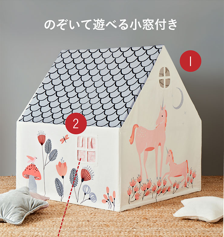 | Kids Tent Unicorn(ユニコーン) 天然木を使ったユニコーンのかわいらしいキッズテント おうちの中がもっと楽しくなる、うれしいアイテムが登場。ユニコーンとお花のイラストが特徴の、お部屋がパッと華やかになるプレイテント 。組み立ても簡単なので、かわいらしい秘密基地があっという間に完成しちゃいます。大切なお子さまの感性を育てるキッズテントはプレゼントにもぴったりなアイテムです。 ■material 素材 世界基準に準拠して安全性と品質にこだわった、ママが安心できる素材 ・ポリエステル…軽くて丈夫なポリエステルは型崩れがしにくく、速乾性にも優れています。 ・パイン材…ニュージーランド産のノットレスパイン(無節松)を使用。お部屋のインテリアにマッチする、天然木のあたたかみのあるフレームです。 ■アメリカのデザイナーがデザインしたこだわりの外観 ■のぞいて遊べる小窓付き ■おしゃれな三角屋根 ■シーンに応じて、入り口を開けたり閉めたり自由自在に遊べます ■組立てやすいパーツナンバー&面ファスナー ■軽くて誰でも簡単に組み立てと解体ができるシンプルな構造 ※本製品は、屋内用です。屋外には設置しないでください。また、水平な場所に設置してください。 ※素材の特性上、直射日光やライトに長時間さらされると変色する可能性がありますのでご注意ください ※対象年齢以下のお子さまはごご使用にならないでください。 ※こちらの商品はお客様組み立てとなります。 ※組み立て方や若干の個体差によって、表記サイズと完成形のサイズに多少の誤差が生じる場合がございます。 ※テント本体のみの販売です。マットやラグ、おもちゃ等は付属しておりません。 | |