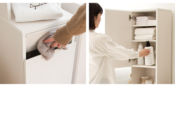 | サニタリーチェスト Allonge(アロンジェ) SH-1600 幅35cm ランドリースペースや、サニタリー周りなどの狭い空間でもデッドスペースを活用して収納をしていただける幅35mのスリムサニタリーチェスト 『Allonge(アロンジェ)』。 可動式の棚で洗剤や小物が収納できる収納棚、入浴時に外したメガネやコスメが置ける天板、脱いだ服やタオルを隠しながら入れられる扉付きの洗濯カゴスペース等々、スリムでも収納力や実用性が高いデザイン。 わずかなスペースにたっぷり収納できて、洗濯カゴも出し入れ簡単なので洗面台や洗濯機の隣にあれば活躍間違いなしです。 ※お客様組み立てとなります。 | |