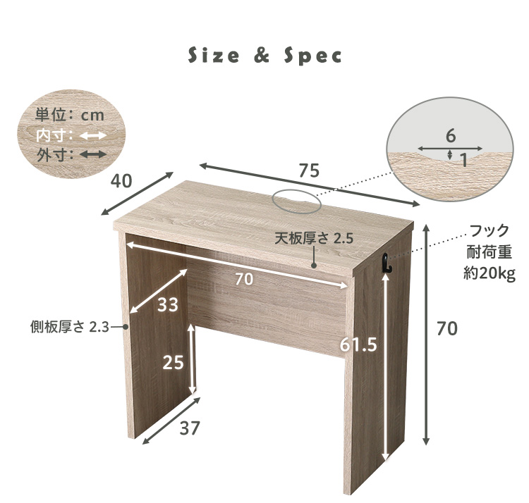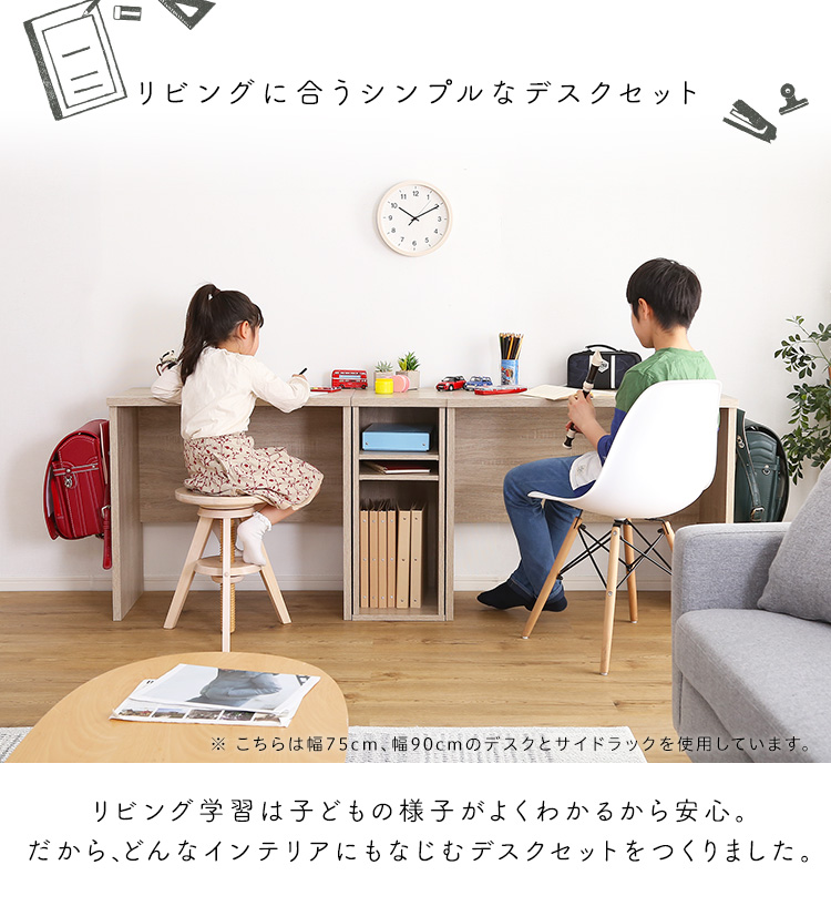 | 子どもから大人まで使えるリビングに合うシンプルデスクセット75cm幅、ラックは30cm幅! 教科書&ノートを広々置ける学習机に! 趣味や家事のワークスペースとしても使えます! 収納力もプラスしたい方にはラックがおすすめです! 奥行・高さは共通なので、どの幅(60、75、90cm幅)のデスクにもピッタリ合います。 便利な3段可動棚で入れたいものに合わせて棚を調整できます。 しっかりした厚みの天板はキズや書き跡に強いPVC仕様です。 デスクのサイドにはランドセルやバッグが掛けれるフック付きです! デスクの背面にはライトやパソコンのコードを通せる隙間を作っているので、スッキリ収納できます。 ※こちらの商品はお客様組立となります。 ※詳細画像をご確認ください。 | |