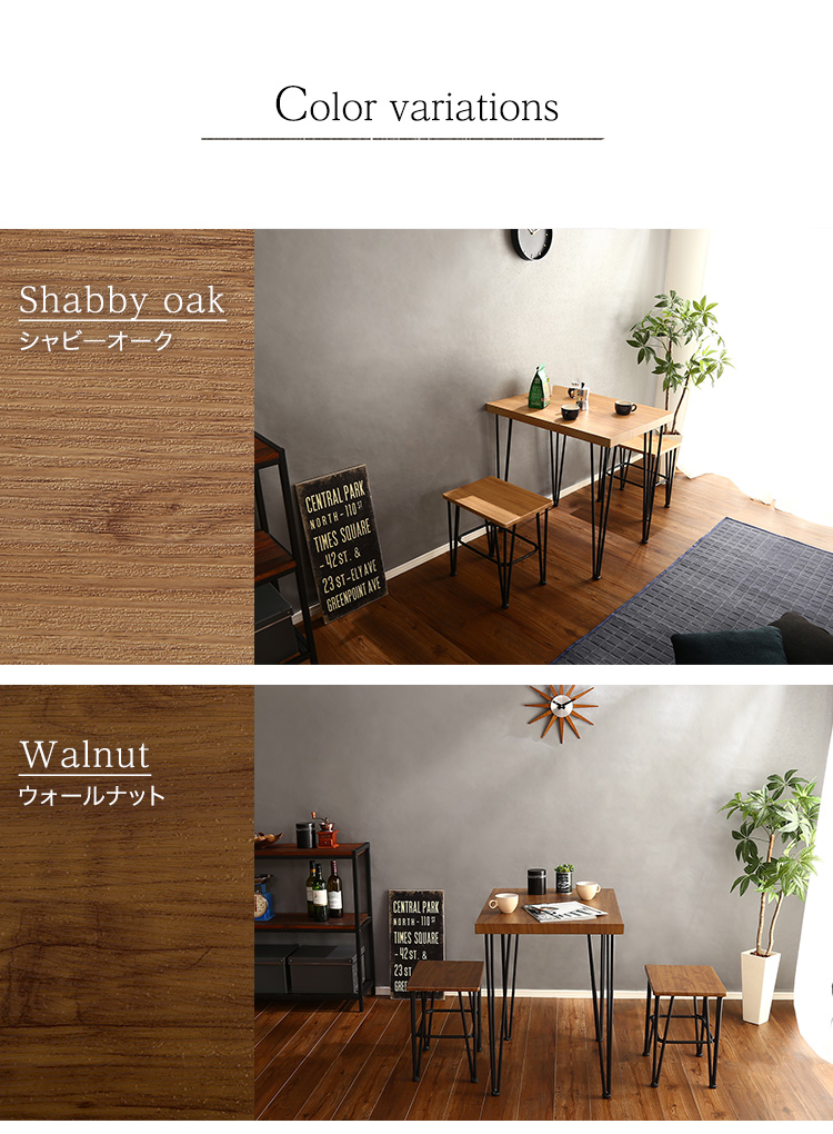 | 鉄脚ダイニング3点セット! 鉄脚なのでスタイリッシュに見え、テーブルひとつでお家をお洒落に! シャビーオーク、ウォールナットの2色でおしゃれなカフェ風スタイルを実現! コンパクトサイズなので、一人暮らしやカップルのお部屋にピッタリです。 ※こちらの商品はお客様組立となります。 ※詳細画像をご確認ください。 | |