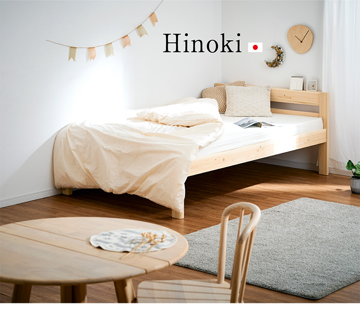 | ひのきのぬくもりあふれる国産ベッド Semi double bed Hinoki(ひのき) セミダブルサイズ ・九州産ひのき使用 ・静止耐荷重200kgクリア ・抗ウイルスの水性塗料使用 ・安心の国産金具+ドイツの老舗メーカー「ハーフェレ」産のカムロック 日本製抗ウイルス塗装を施したひのきの魅力を最大限に感じられる『大川産』セミダブルベッド。 無駄のないシンプルなデザインでどんなお部屋にもやさしく溶け込むセミダブルベッド 「ひのき」。フレーム、すのこ、棚板などの構成部材すべてには九州産ひのき材を贅沢に使用しており、節のあるナチュラルな木目と風合いが寝室を素朴であたたかい空間にしてくれます。 ■お子さまから大人まで長くお使いいただけるようにシンプルなデザインに仕上げました。ちょっとした物が置ける宮棚はお好みで取り外しが可能です。 ■身体と環境に優しい抗ウイルスの水性塗料使用、日本塗料メーカー和信の抗ウイルス塗料を施しました。ひのき本来の優しい木目と肌触りをそのままに、汚れ防止、UVカット効果のある水性塗料を使用しています。水性塗料は文字通り、水で溶かしている為、塗料特有のきつい匂いがなく、身体や環境にやさしい環境対応型塗料と言われています。 ■通気性抜群、調湿効果もある国産高品質ひのきスノコ 通気の良いひのきスノコには、お部屋の中の湿度に応じて空気中の水分を吸収・放出するという調湿作用があるので、1年を通して快適にお休みいただけます。 ※こちらの商品はお客様組み立てとなります。 ※組み立て方や若干の個体差によって、表記サイズと完成形のサイズに多少の誤差が生じる場合がございます。 ※こちらの商品はベッド本体のみの販売となります。マットレスや寝具、その他小物類は付属しておりません。 | |